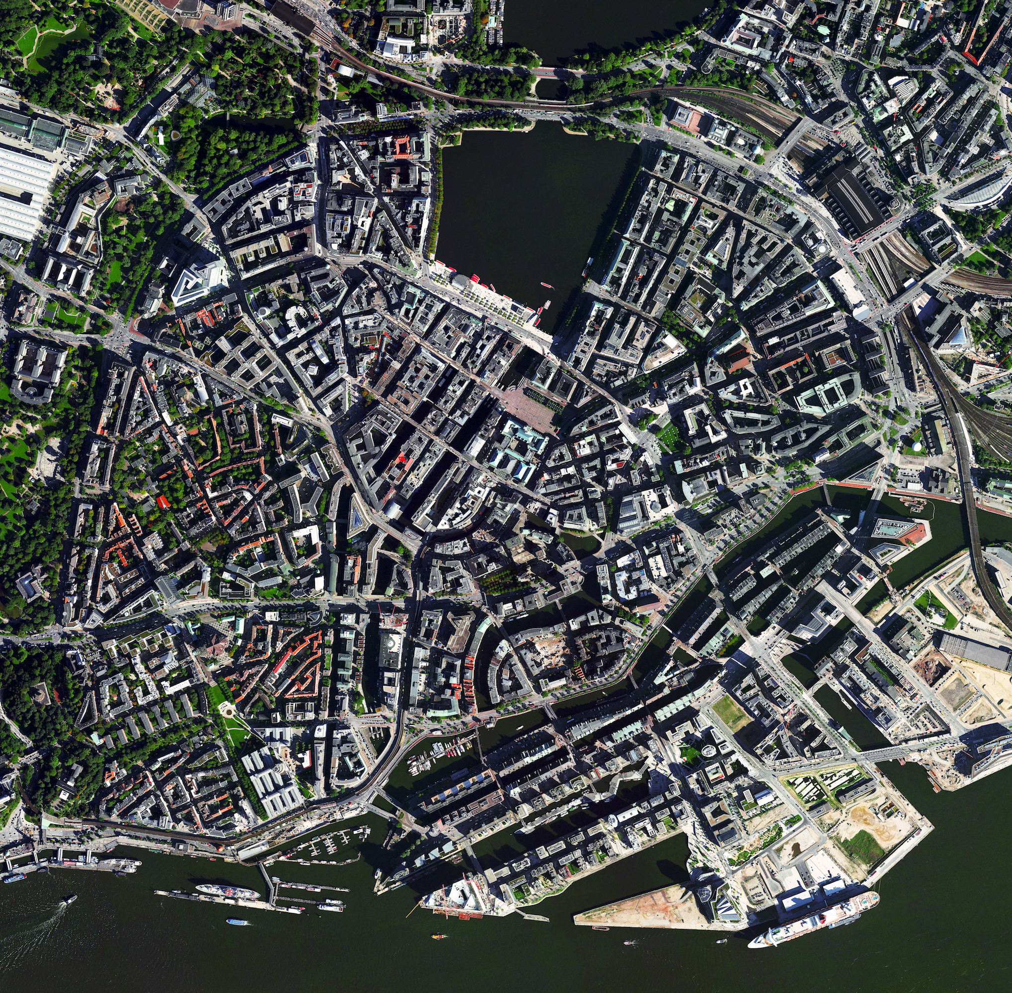Hamburg is the second largest city in Germany and seventh largest in the European Union, with a population of more than 1.8 million. The city center is seen here situated around the Binnenalster, one of two artificial lakes built within its limits. Located on the River Elbe, Hamburg contains the third busiest port in Europe, shipping roughly 145 million tonnes of goods every year.