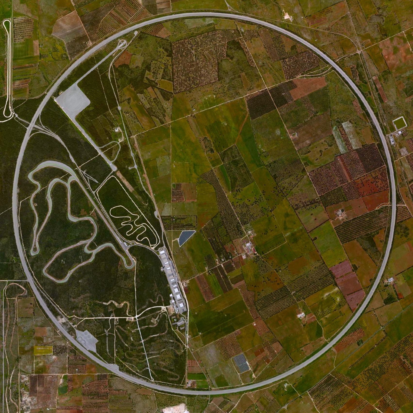 The Nardò Ring is a high speed, 7.8 mile long, circular test track in Nardò, Italy. Each of the ring’s four lanes has a determined “neutral speed” and is banked in such a manner that one can drive as if the road were straight.