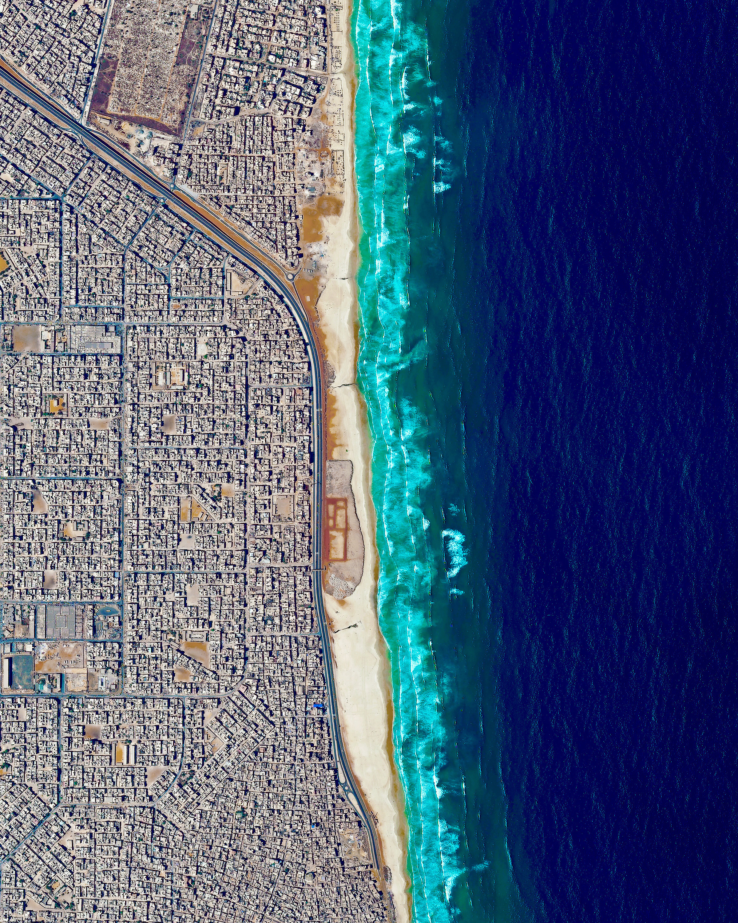 Waves roll into the northern shore of Dakar, the capital and largest city of Senegal. Roughly 1 million people live in the city proper and another 1.4 million inhabit its greater metropolitan area. Situated on the Cap-Vert (Cape Verde) Peninsula on the Atlantic Ocean, Dakar is the westernmost city on the African mainland.
