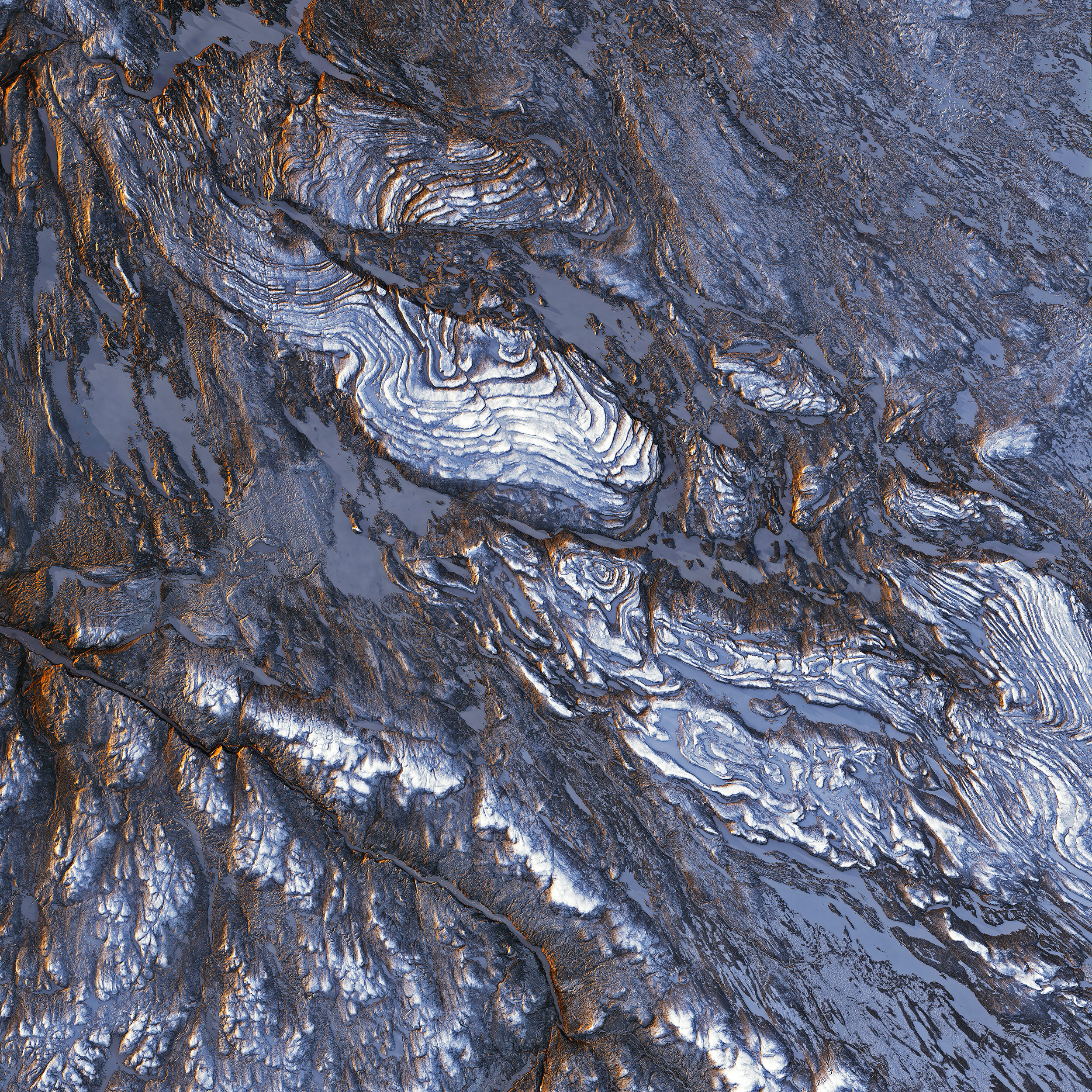 Swirling folds of basaltic rock can be seen in the New Quebec Orogen, a large geologic belt in northeastern Canada. This area, also known as the Labrador Trough, covers an area of about 98,000 square miles (254,000 square km) and was formed some 2.17 billion years ago as molten rock erupted from rifts in the Earth’s crust flooded the landscape with basalt. The cliff face of each flow or “step” in this formation stands between 160 and 230 feet (50-70 m) tall.