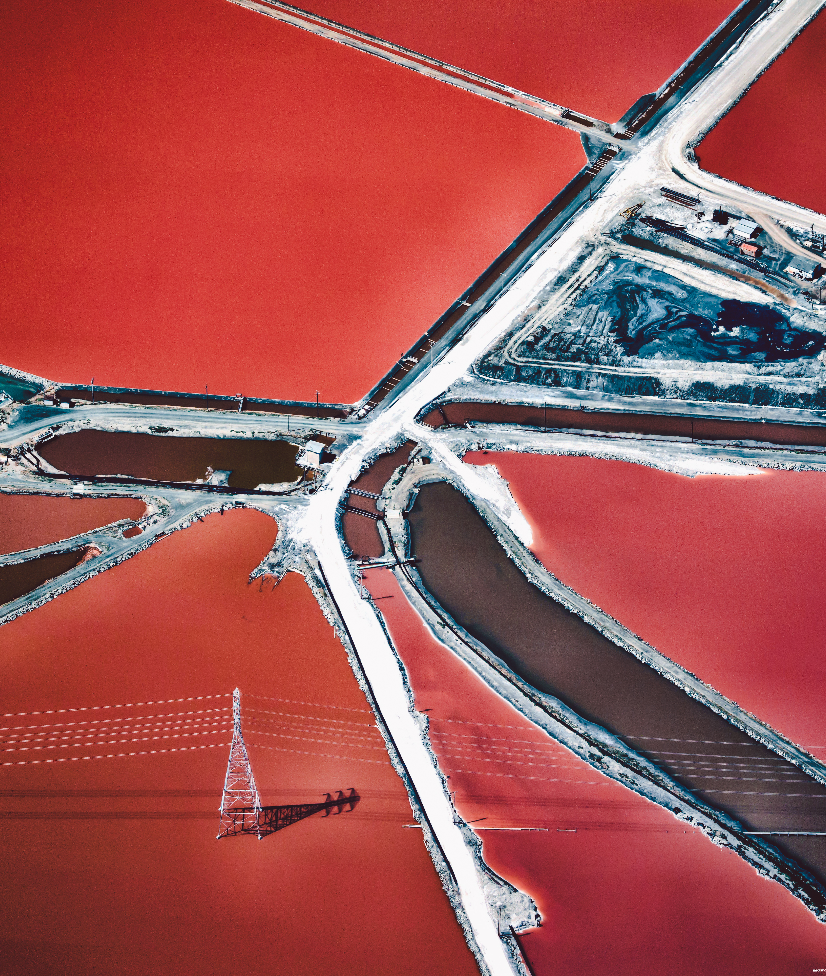 Electric wires stretch across bright red salt ponds in San Francisco Bay, California. Here, sea water is channelled into large ponds and exits through natural evaporation, leaving the salt behind to be collected. The massive ponds get their vibrant reddish colors from the algae that thrive in the extremely salty water.