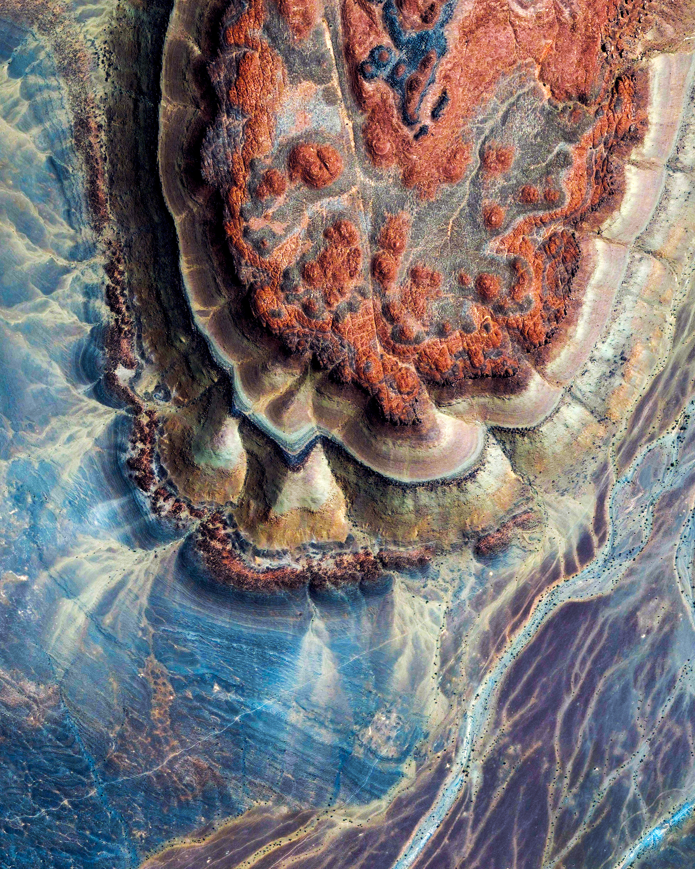 Amazing layered rock patterns are visible on the Adrar Plateau, near the town of Atar in northwestern Mauritania. Located within the Sahara Desert, the Adrar is an arid plateau known for its gorges, stony deserts and sand dunes. Cave and rock paintings show that this region was settled in the Neolithic era about 12,000 years ago — today, around 62,000 people live in the Adrar Region.