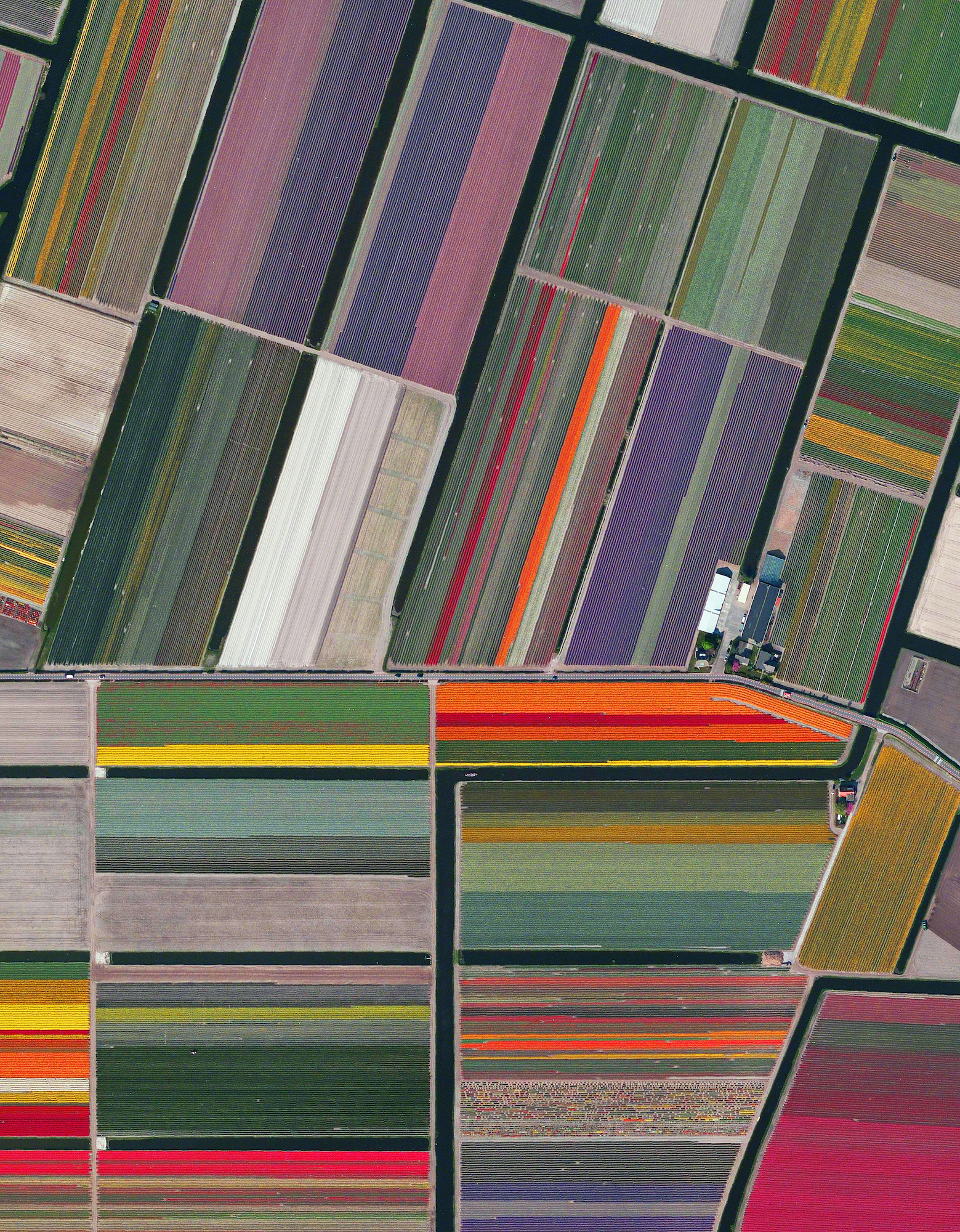 Lines of colorful tulips in Lisse, Netherlands to honor the birthday of my favorite artist, Piet Mondrian! The Netherlands, where Mondrian was born on this day in 1872, produces 4.3 billion tulip bulbs every year. Mondrian is most well known for his paintings with straight black lines and blocks of the three primary colors.