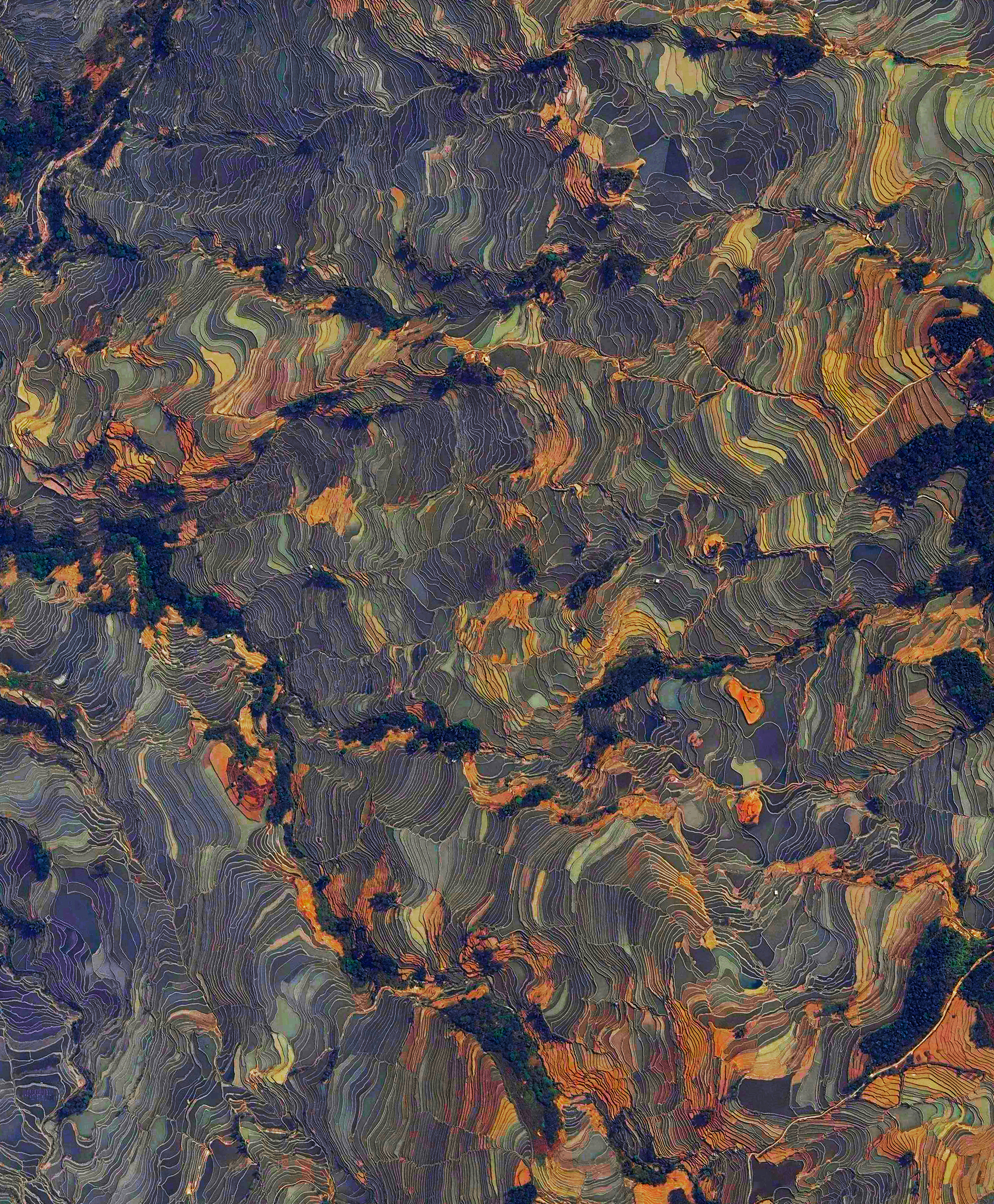 Rice paddies, constructed in steps, cover the mountainsides of Yuanyang County, China. Cultivated by the Hani people for the last 1300 years, the slope of the terraces varies from 15 to 75 degrees with some having as many as 3,000 steps.