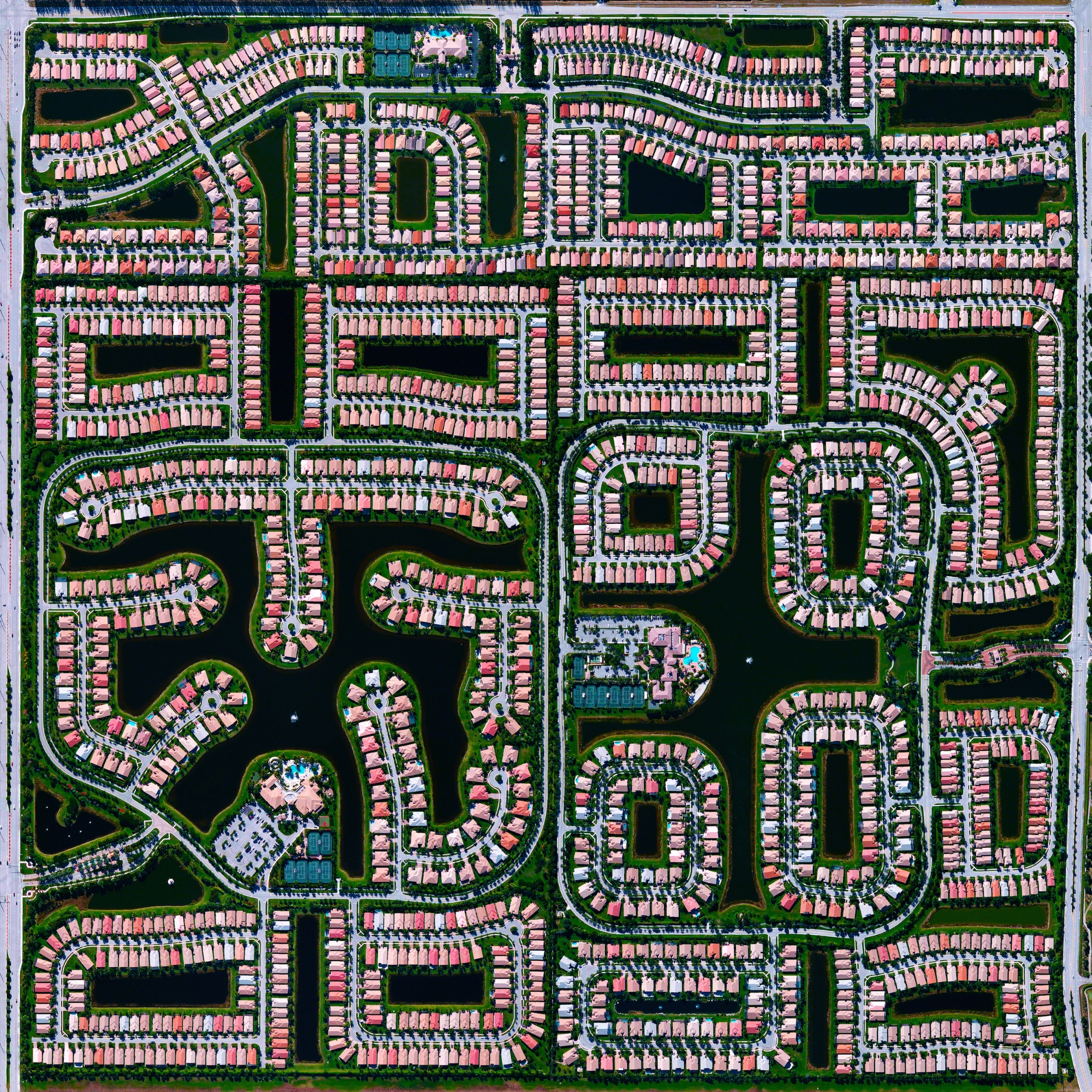A residential community is seen here in Delray Beach, Florida, USA. Because many cities in the state of Florida contain master-planned communities, often built on top of waterways in the latter half of the twentieth century, there are a number of intricate designs such as this one that are visible from the Overview perspective.