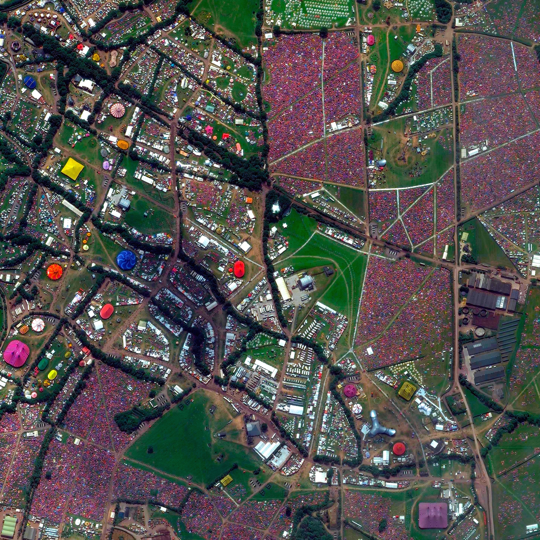 The Glastonbury Festival concluded yesterday in Pilton, England. The annual, five-day music event was attended by more than 135,000 people. Concert-goers are provided a campsite at the venue but must bring their own tents - which vividly dot the landscape in this Overview. The population of Pilton on the other 360 days of the year is 998.