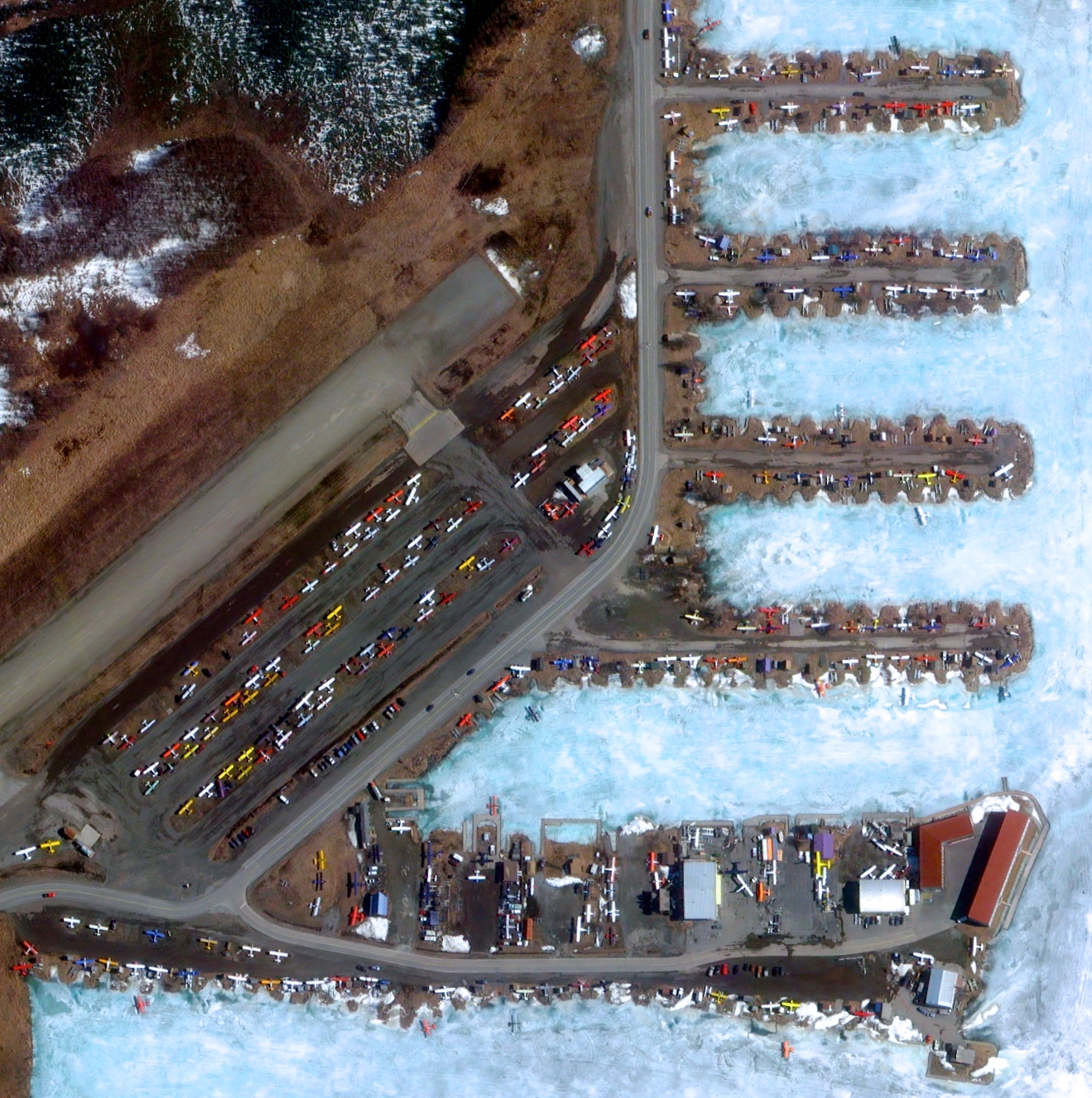 The Lake Hood Seaplane Base, captured here during the frozen-over winter, is located in Anchorage, Alaska, USA. Handling an average of 190 flights per day, the facility is the world's busiest airport for seaplanes.