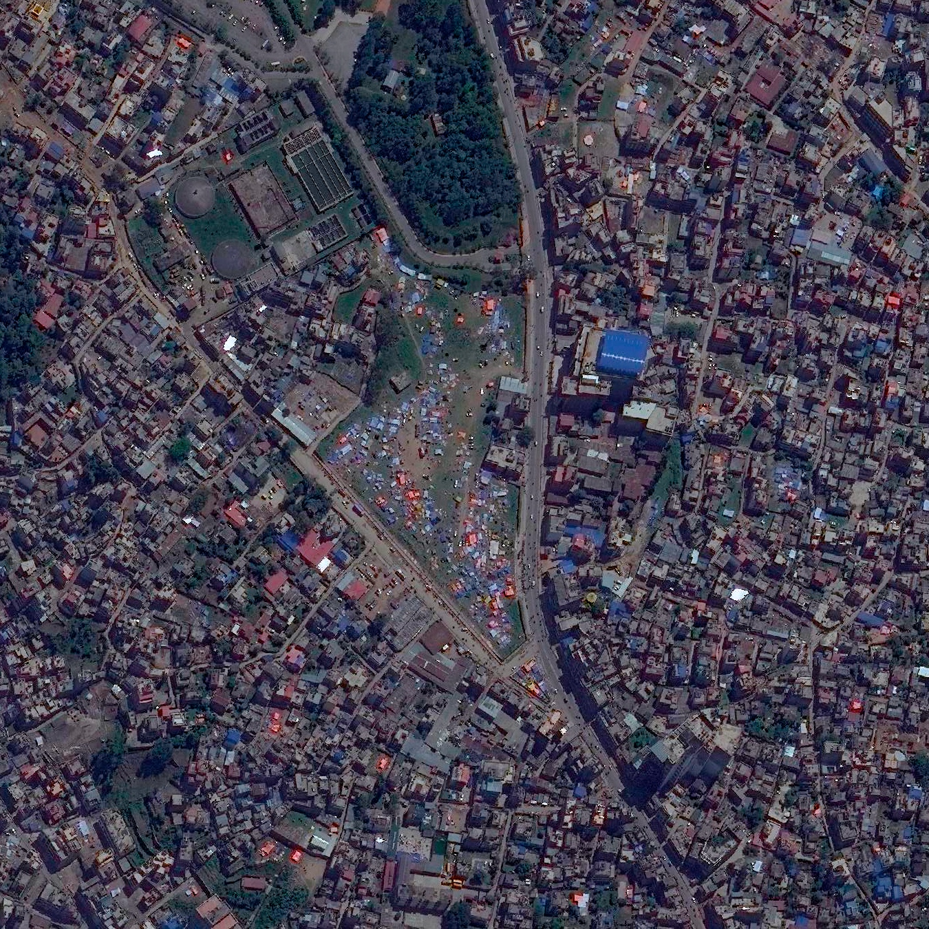 As many of you know, a powerful earthquake struck the country of Nepal this past Saturday. Due to tremendous damage and fear of aftershocks, many people have moved to open spaces outdoors. Satellite images taken in recent days over the city of Kathmandu show a number of these shelters appearing across the city - like the ones seen in this Overview of Tara Goan Park. To donate to Red Cross relief efforts, click . Our thoughts are with the people of Nepal during this difficult time.