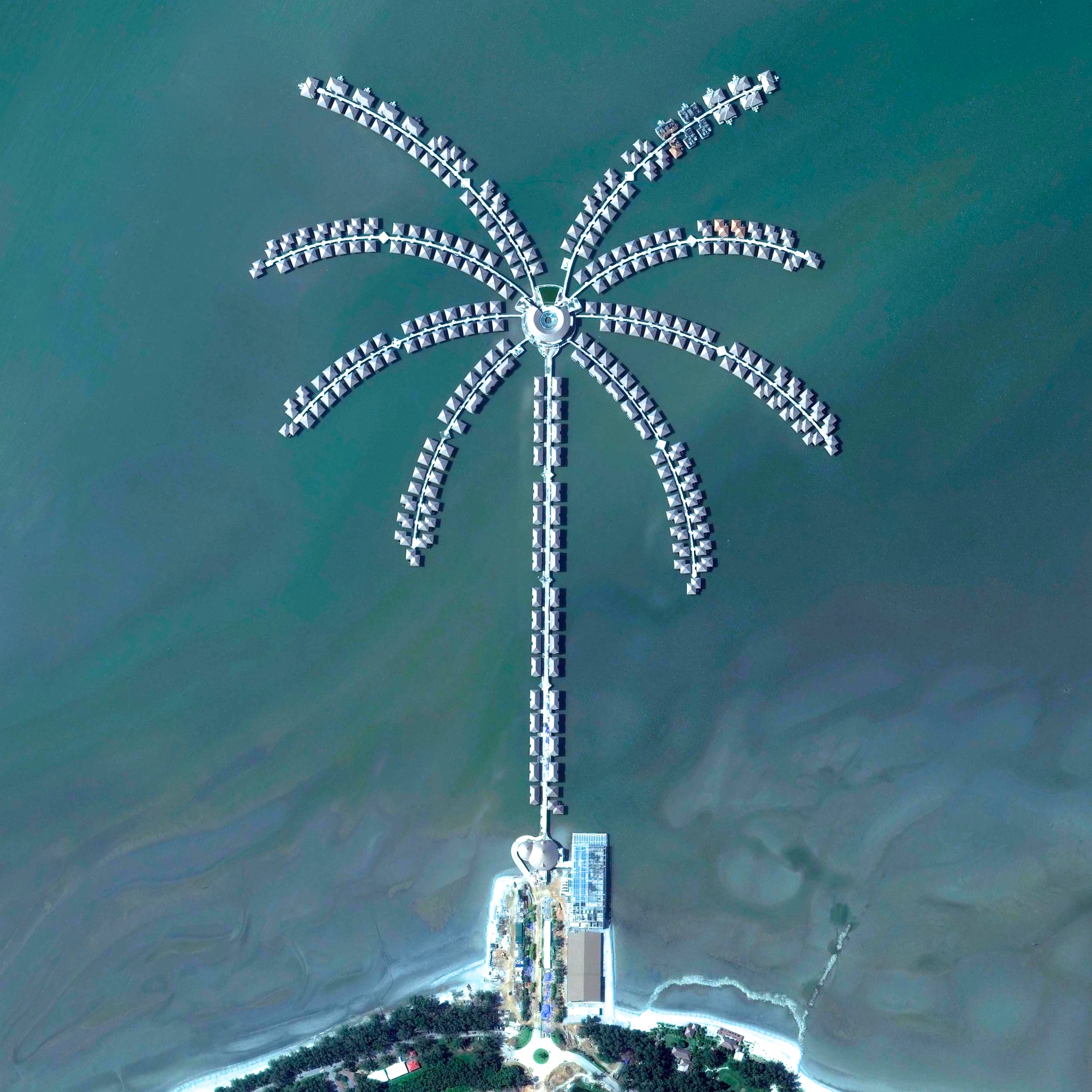 We’re feeling very tropical with this Overview of the Sepang Goldcoast Resort in Selangor Darul Ehsan, Malaysia. The hotel features over-water bungalows that extend out in a palm-shaped formation into the calm waters of the Malacca Straits.