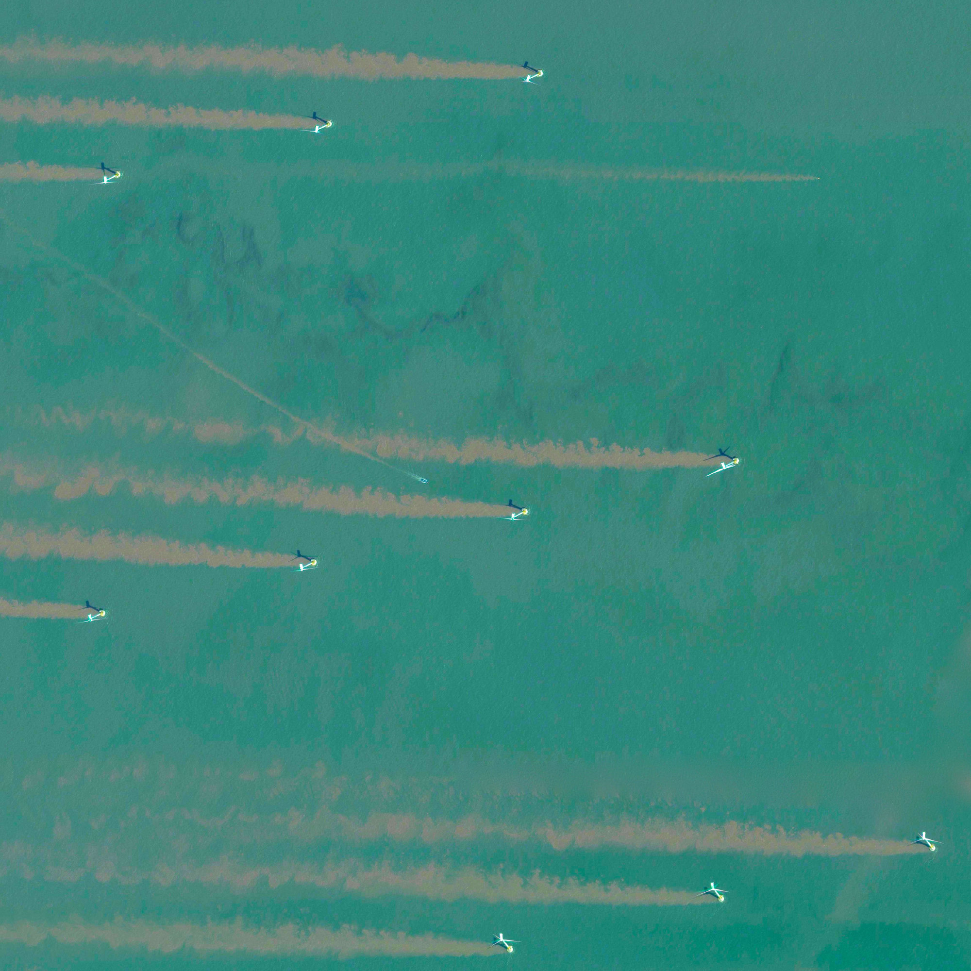 Turbulence fields form behind the turbines of the Donghai Bridge Wind Farm in Shanghai, China. These streaks occur when wind hits the turbines' towers or when certain meteorological conditions cause the turbines to create condensation (i.e. clouds) of very humid air.