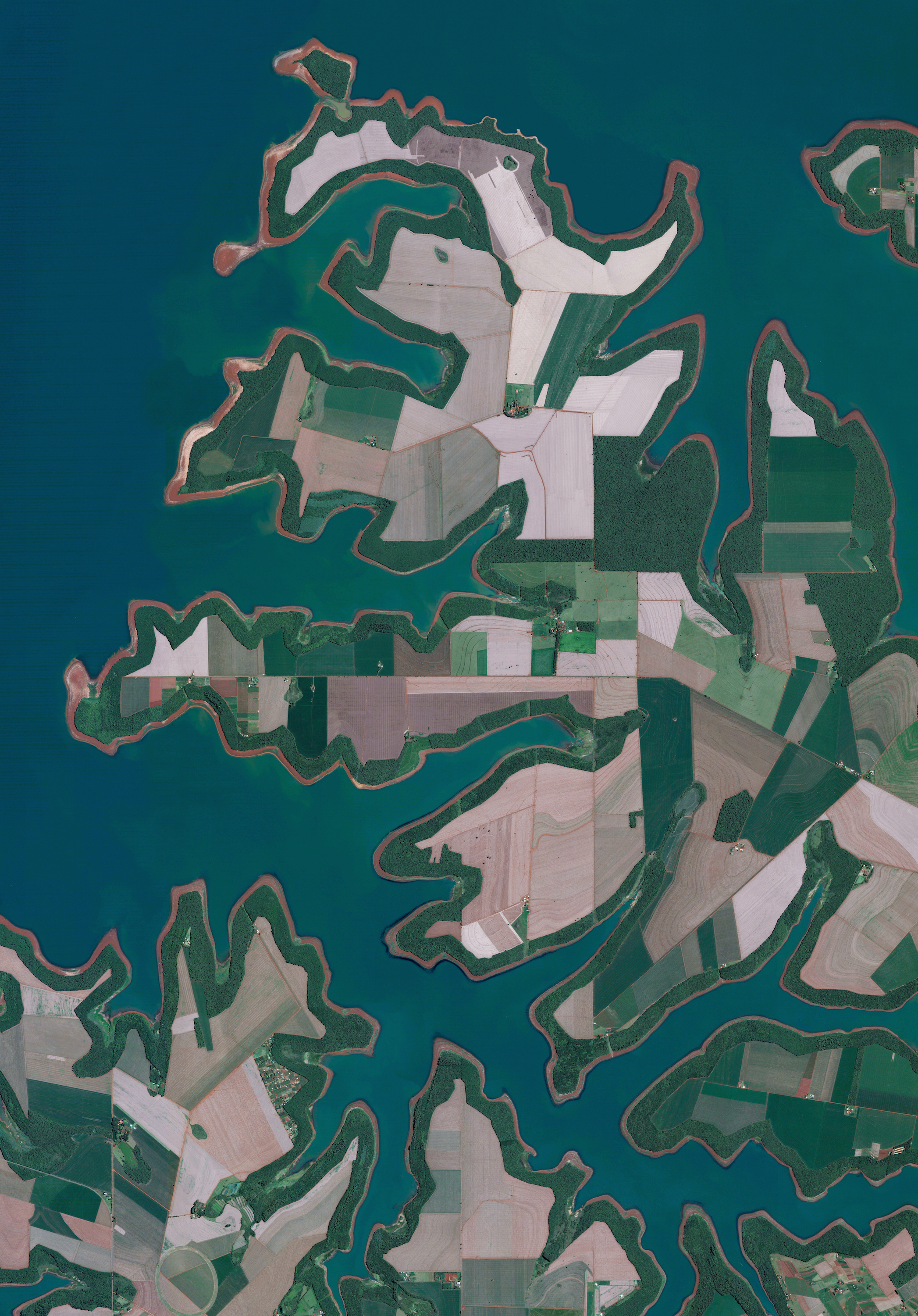 Agricultural fields line the shores of the Itaipu Reservoir—a body of water that forms the border between Brazil and Paraguay. The area’s tropical climate makes it an ideal place to grow sugarcane, coffee, tea, and cotton.