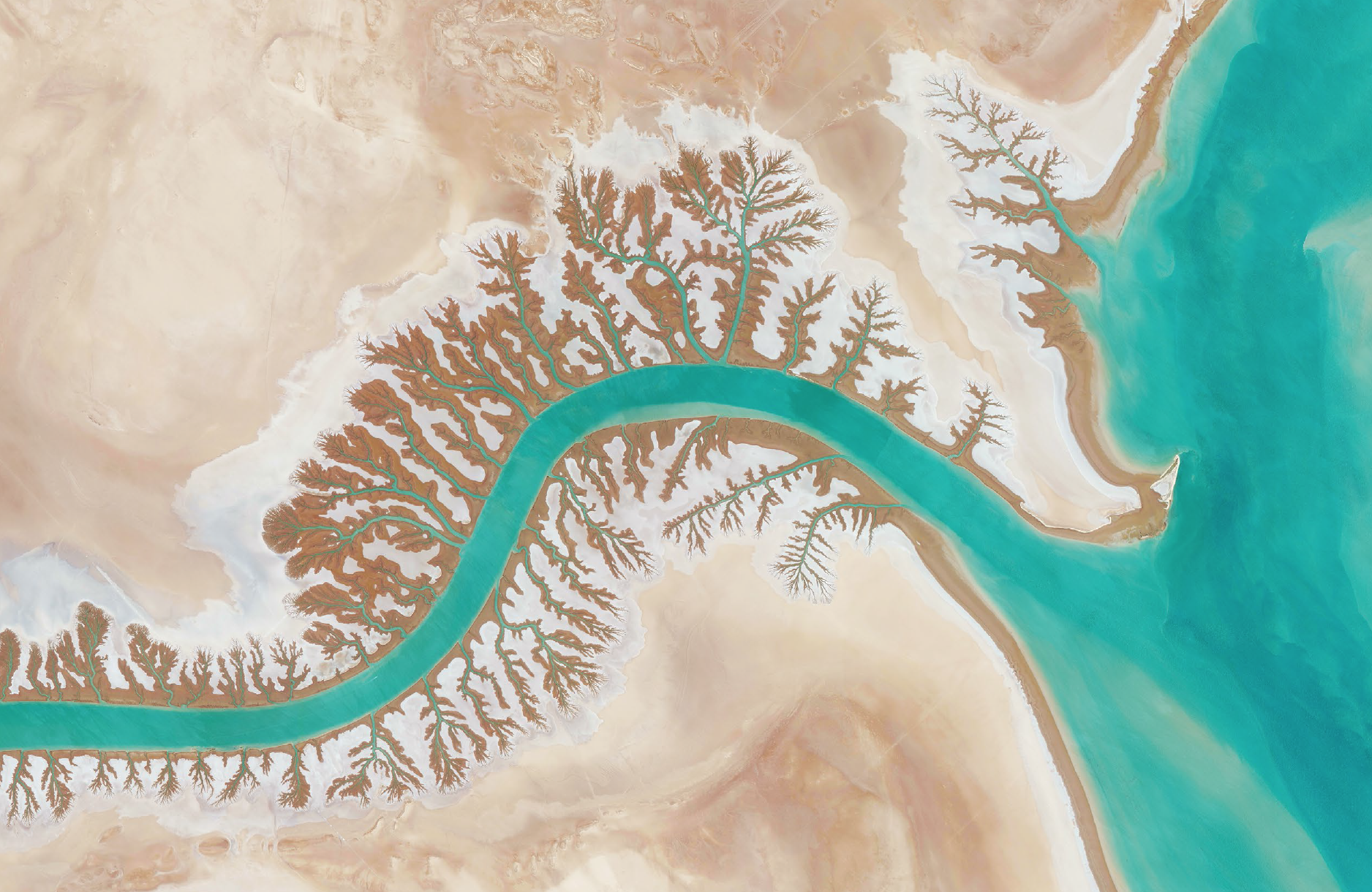 A dendritic drainage pattern is seen around the Shadegan Lagoon by Musa Bay in Iran. Dendritic literally means branched, as in resembling the pattern of a tree. This shape develops when streams move across relatively flat and uniform rock or over a surface that resists erosion.