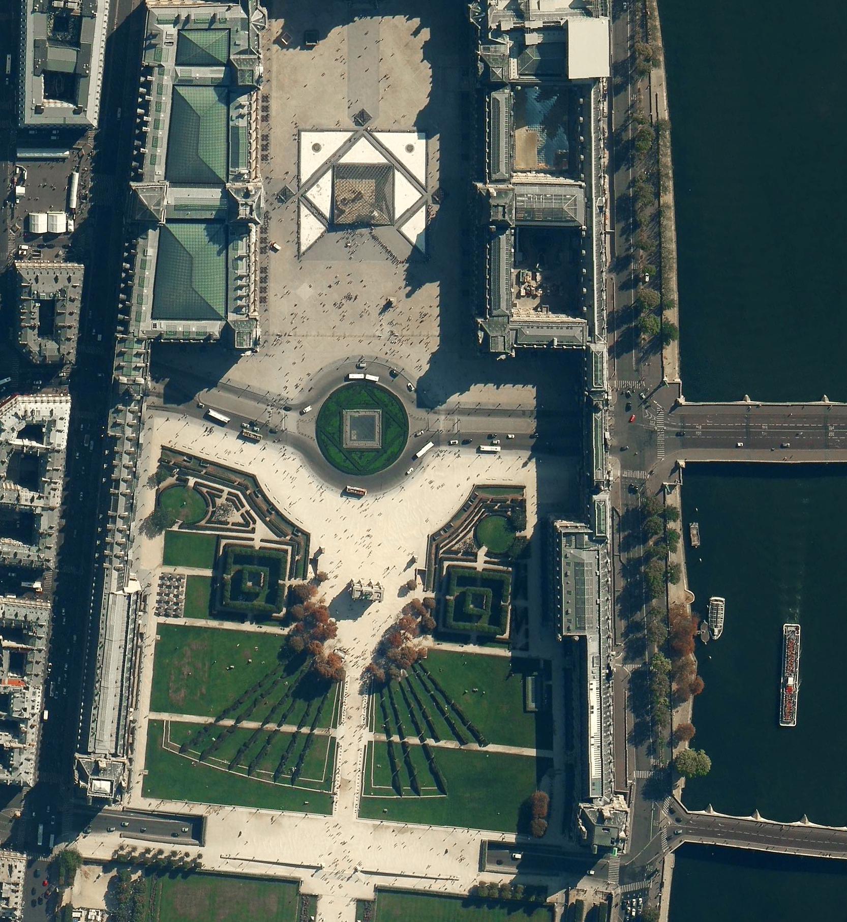 A river cruise passes by the Louvre Museum in Paris, France. Located on the Seine River, the Louvre is the world’s most visited museum, receiving more than nine million visitors per year. The entrance to the museum, seen at the top and center of this Overview is a glass and metal pyramid, designed by architect I.M. Pei. Visitors enter through the pyramid, descend into the spacious lobby, and then re-ascend into the wings of the museum.