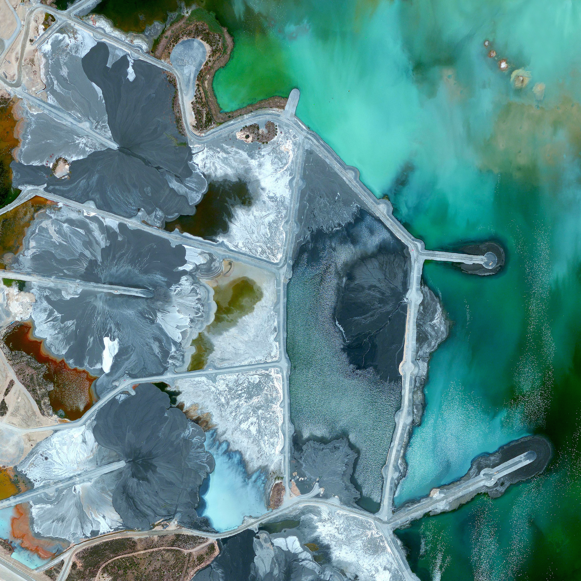 Waste ponds are seen at the Neves-Corvo Mine in the Castro Verde Municipality in Portugal. Zinc and copper and the primary resources extracted from the mine and the byproducts of that extraction is sent to these basins three kilometers away. Typically, once waste materials are pumped into a tailings pond, they are mixed with water to create a sloppy form of mud known as slurry. The slurry is then pumped through magnetic separation chambers to extract usable ore and increase the mine’s total output.