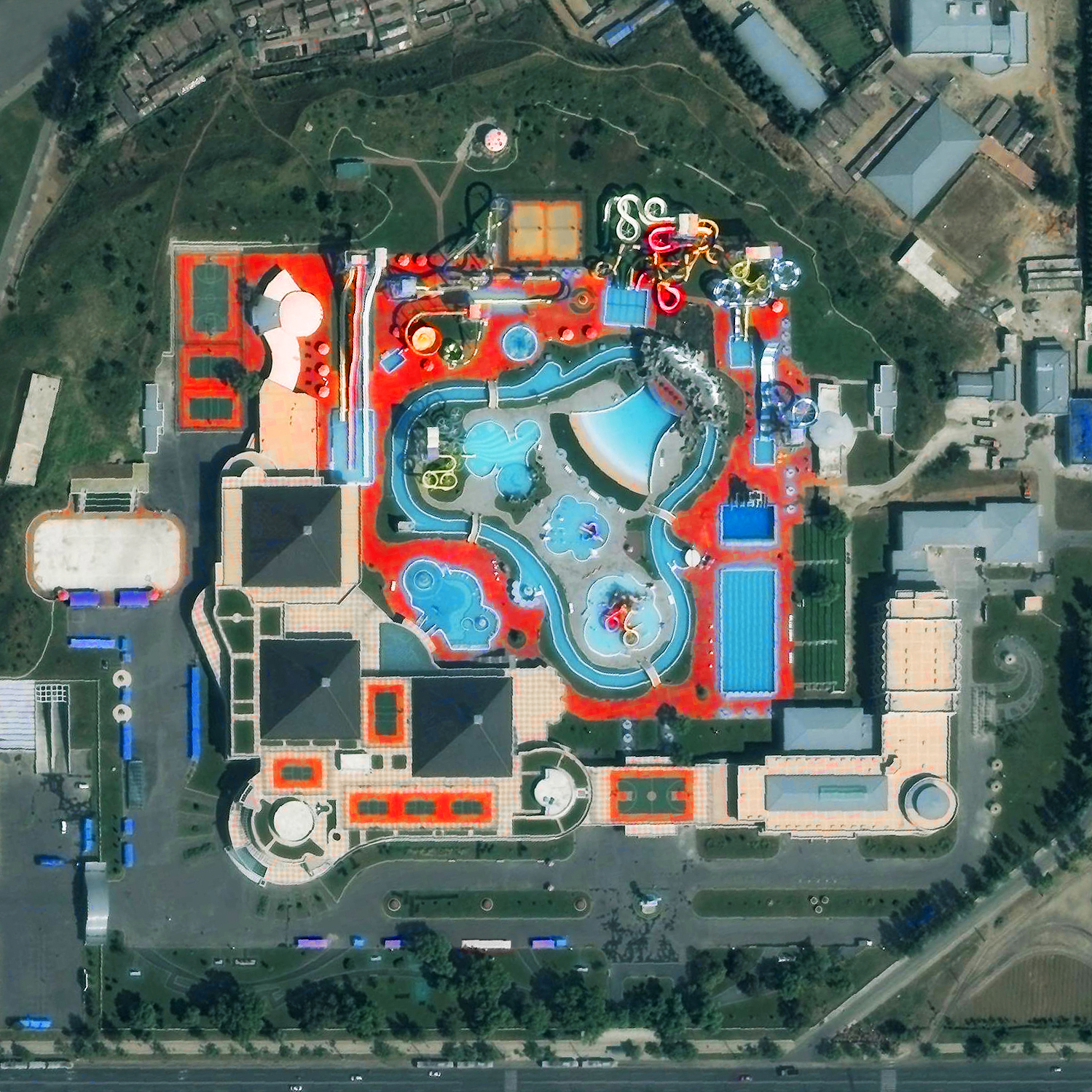 Munsu Water Park is located in Pyongyang, North Korea. The facility is open year-round with water slides, indoor and outdoor swimming pools, various sport courts, and a rock climbing wall.