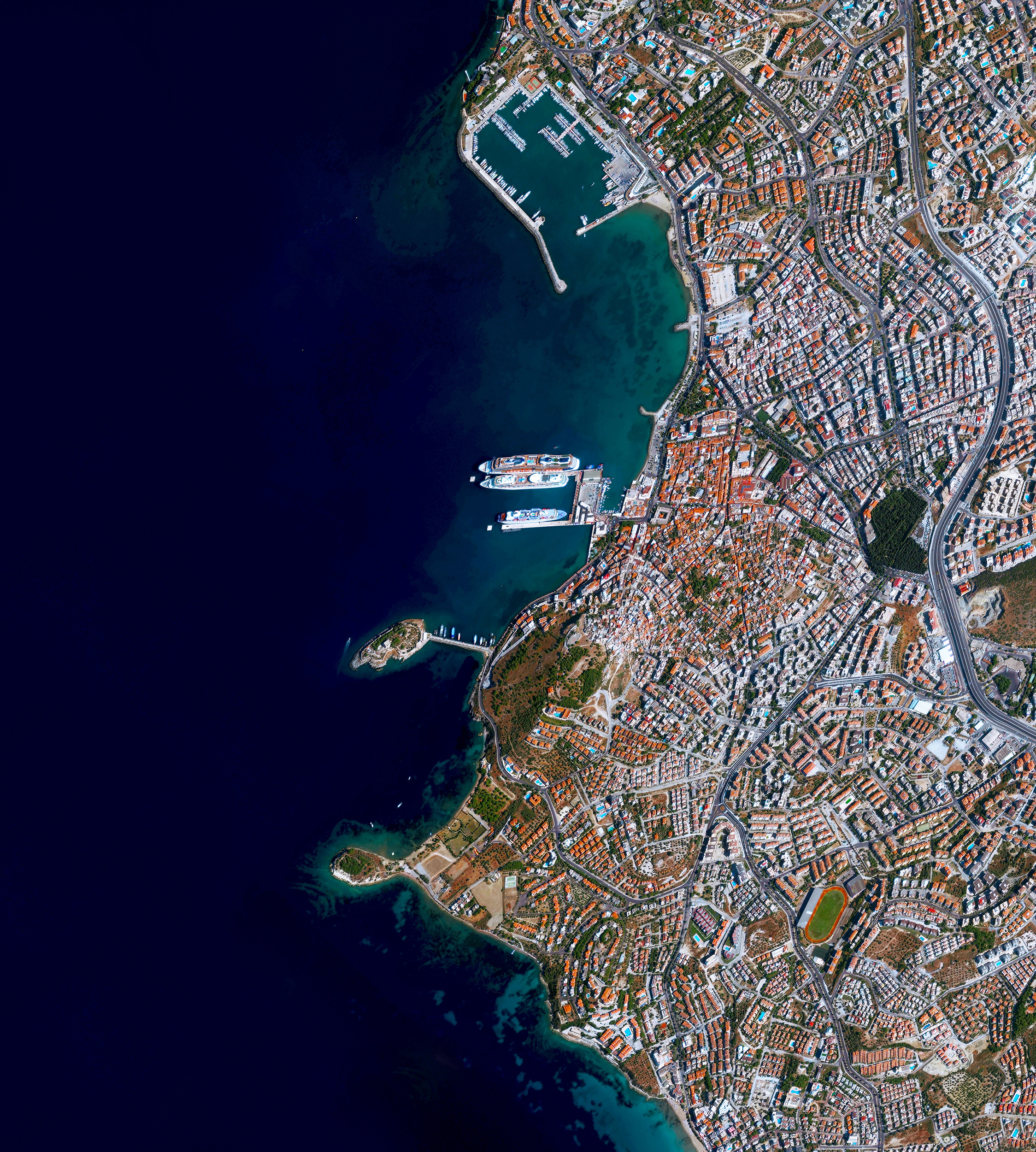 Kuşadası is a resort town located on the Aegean Sea in Turkey. While the town has roughly 64,00 residents for most of year, in the summer months its population can rise to nearly half a million people with the influx of tourists.