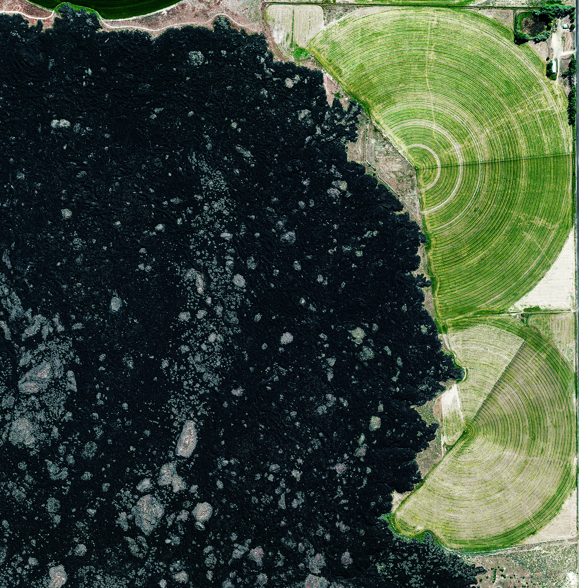 Pivot irrigation fields surround a lava field known as The Cinders, in Millard County, Utah. Along with farming, one of the elements of Millard County's economy is fossil digging as Trilobite fossils are relatively common in the region west of Delta.