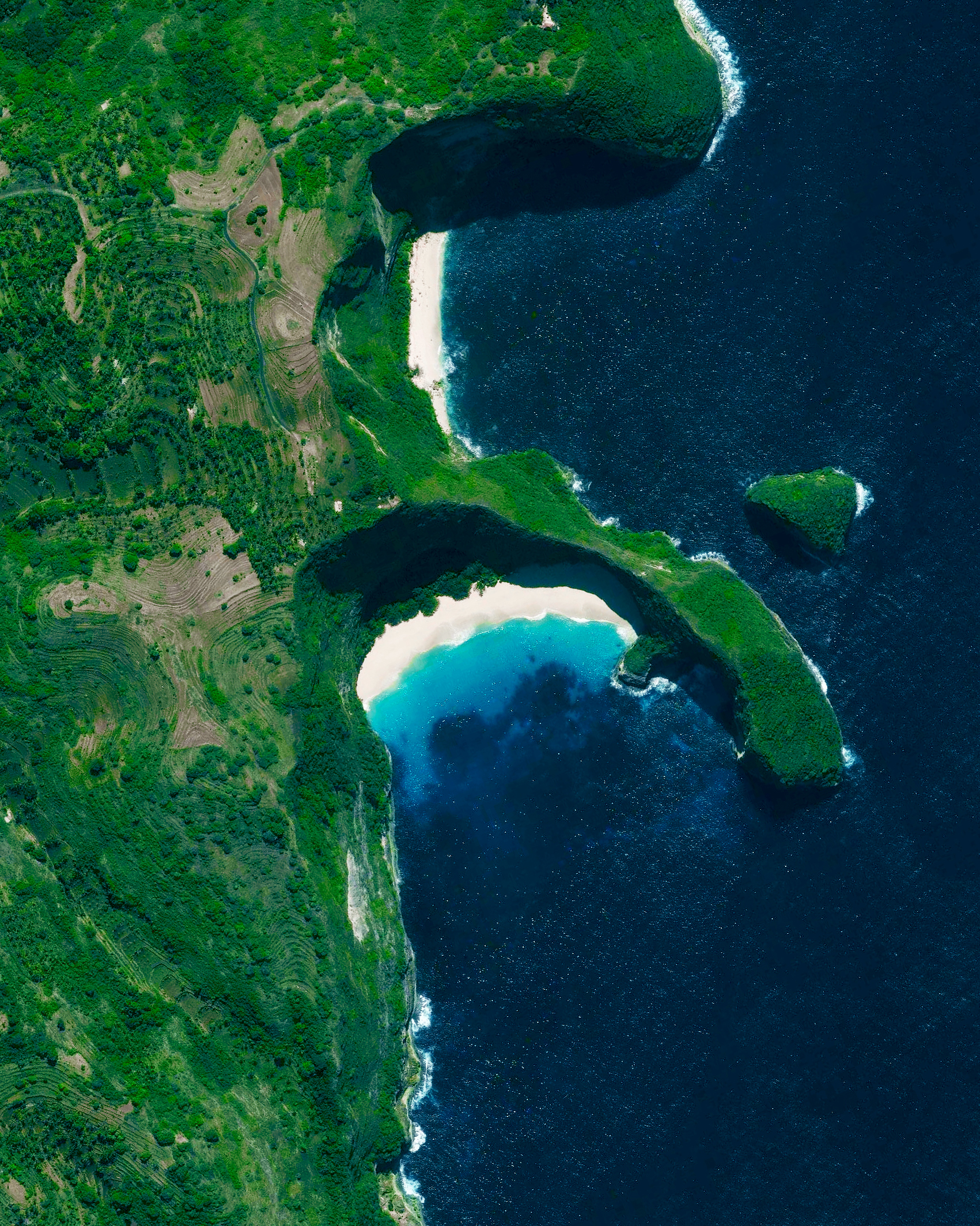 Two secluded beaches are seen on the island of Nusa Penida, located off the southeastern coast of Bali. The island has come to be the unofficial bird sanctuary for numbers of endangered Balinese and Indonesian bird species, most notably the Bali Starlin.