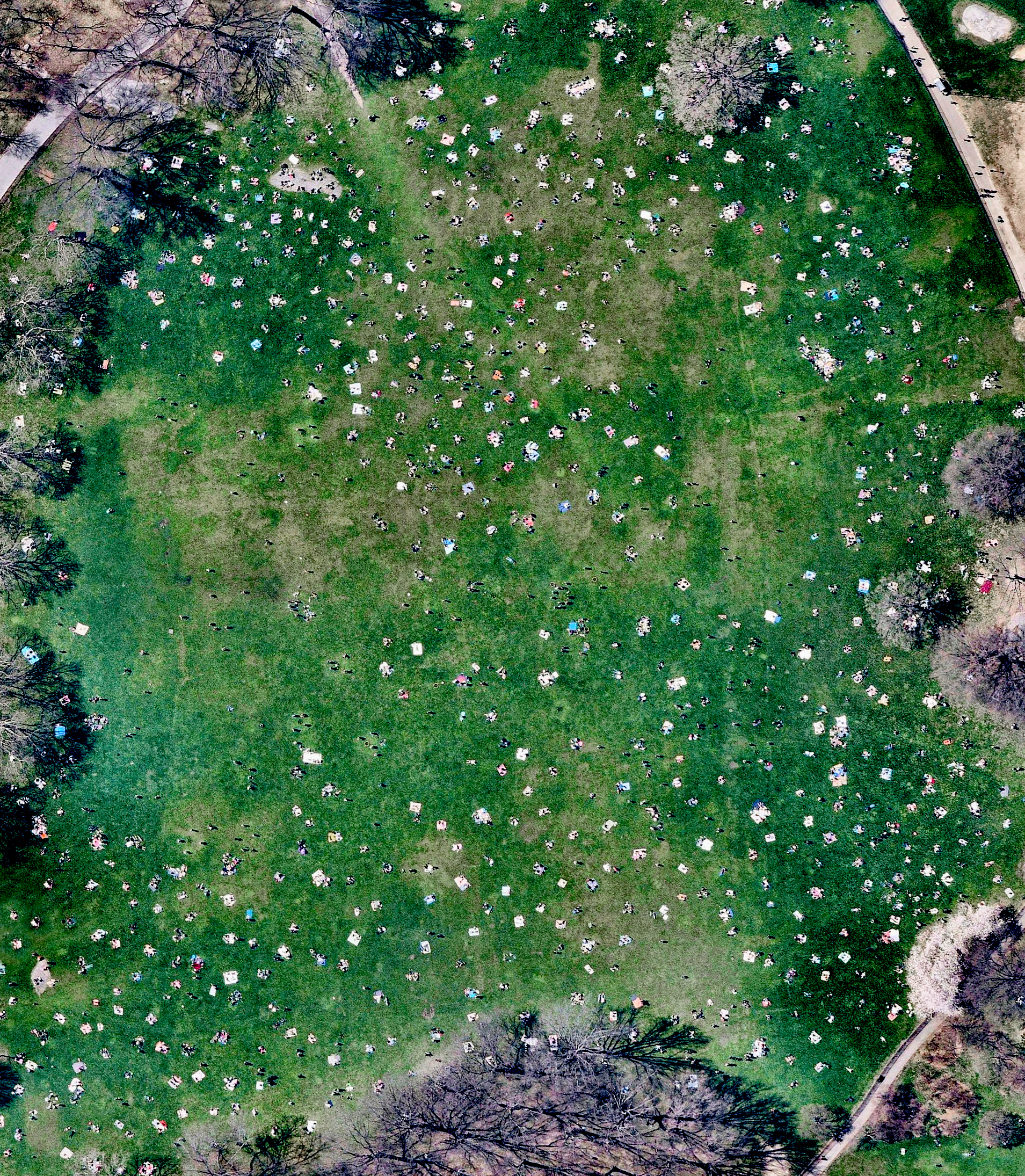 Sheep Meadow covers 15 acres on the west side of Central Park in New York. As seen in this Overview, the meadow often draw massive crowds of sunbathers looking for a place to lay out, and can attract up to over 30,000 visitors a day in the summer months.