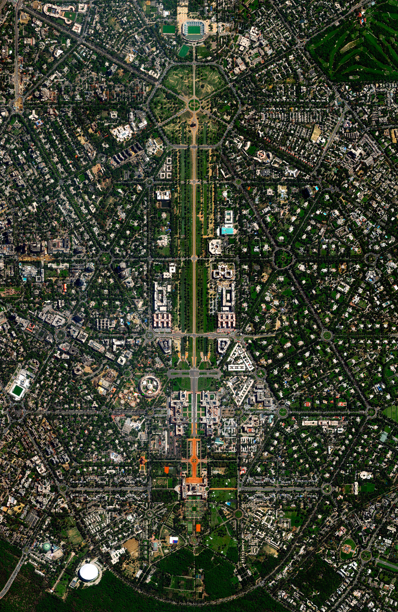 New Delhi serves as the capital of India and is home to more than 21 million residents in its metro area. Officially inaugurated in February 1931, the city was planned by British architects Sir Edwin Lutyens and Sir Herbert Baker. Their design centered around two promenades - the Rajpath and the Janpath - that run perpendicular to each other and intersect here at center.