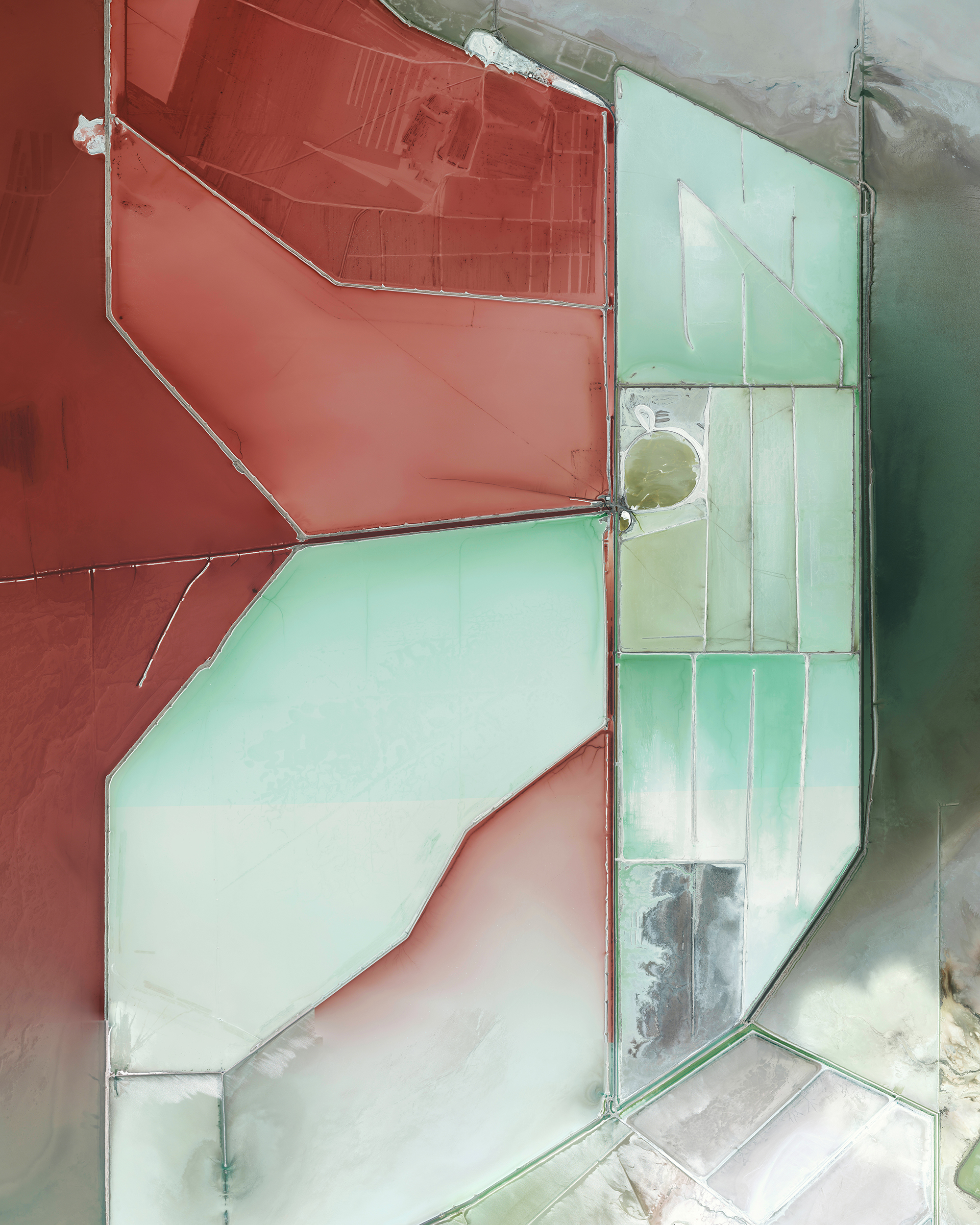 Tailings are the waste and by-products generated by mining operations. The tailings seen here were pumped into the Gribbens Basin, next to the Empire and Tilden Iron Ore Mines in Negaunee, Michigan, USA. Once the materials are pumped into the pond, they are mixed with water to create a sloppy form of mud known as slurry. The slurry is then pumped through magnetic separation chambers to extract usable ore and increase the mine’s total output. For a sense of scale, this Overview shows approximately 2.5 square kilometers (1 square mile) of the basin.