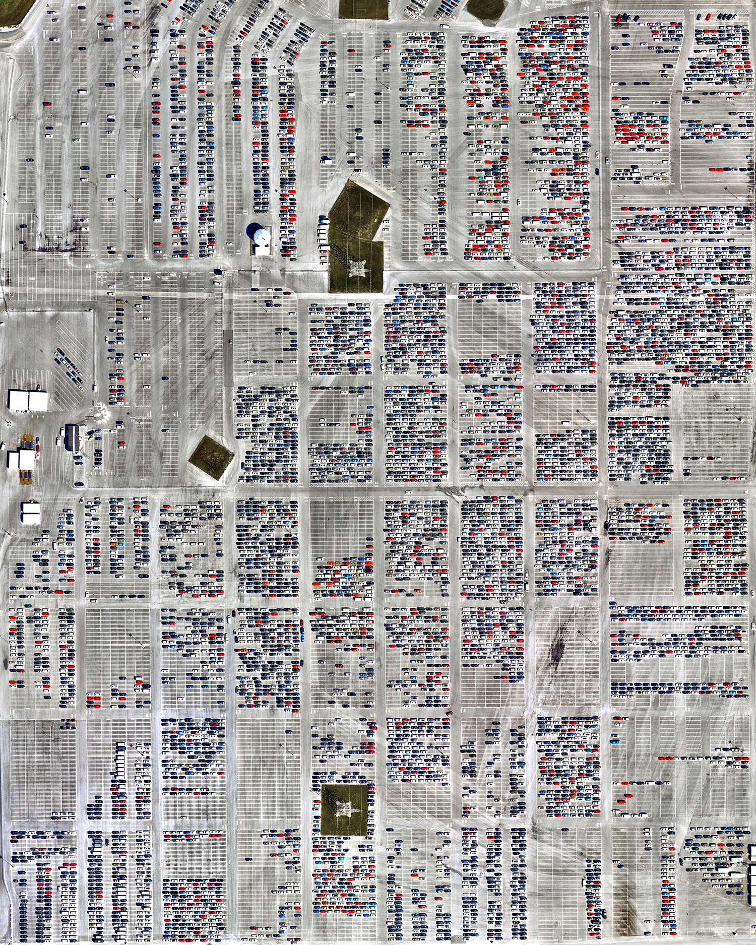 Vehicles await auction on a large lot in Manheim, Pennsylvania. Founded in 1945, this facility is the world’s largest wholesale auto auction, handling around 8 million vehicles per year at more than 100 locations worldwide. The lot seen in this Overview is approximately 500 acres (200 hectares) in size.