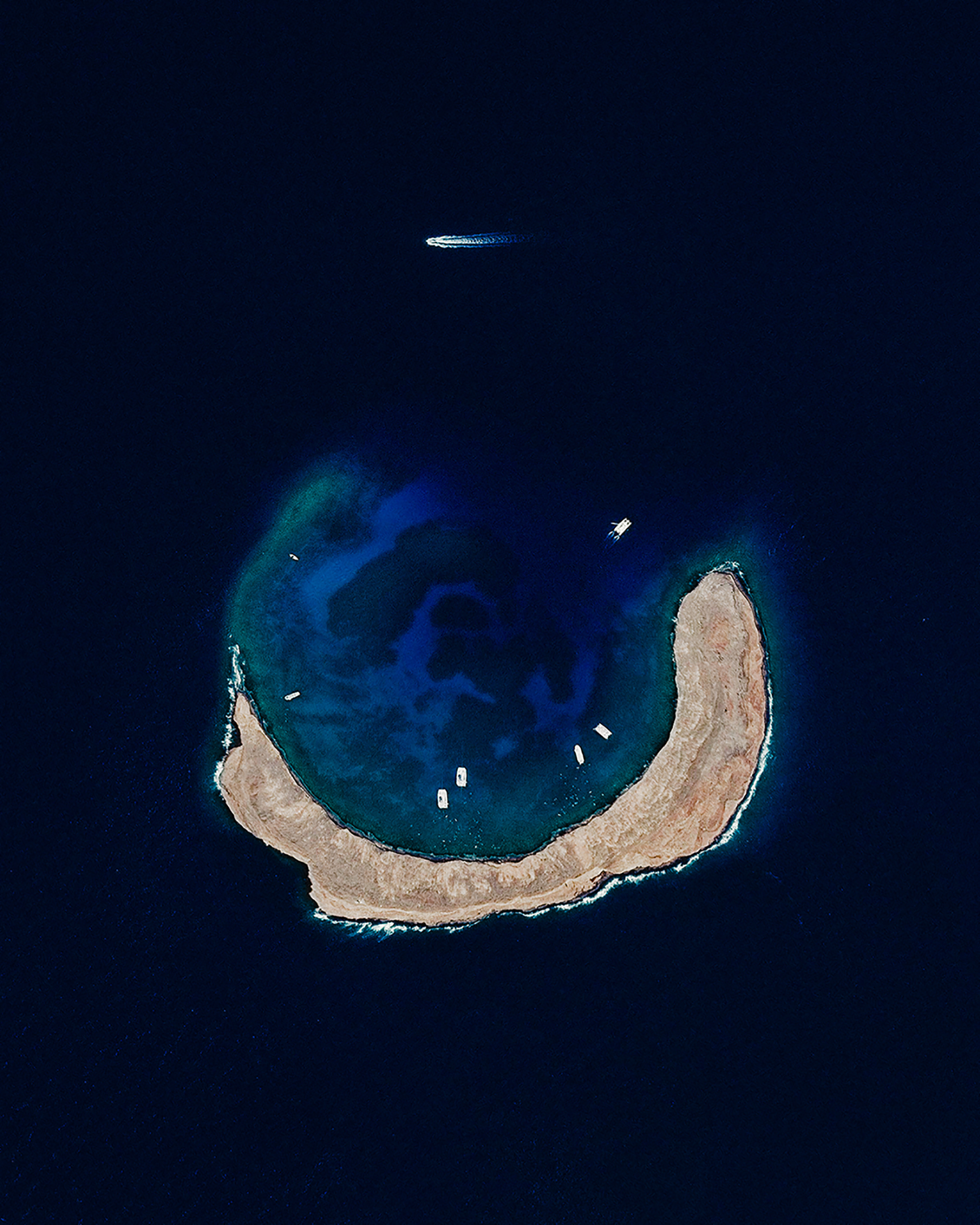 Molokini is a small, uninhabited islet located between the Hawaiian Islands of Maui and Kahoolawe. It is formed by a crescent-shaped, partially submerged volcanic crater roughly 0.4 miles (0.6 km) in diameter. A lush reef inside the Molokini Crater is home to about 250 species of fish, making it a popular destination for scuba divers and snorkelers.