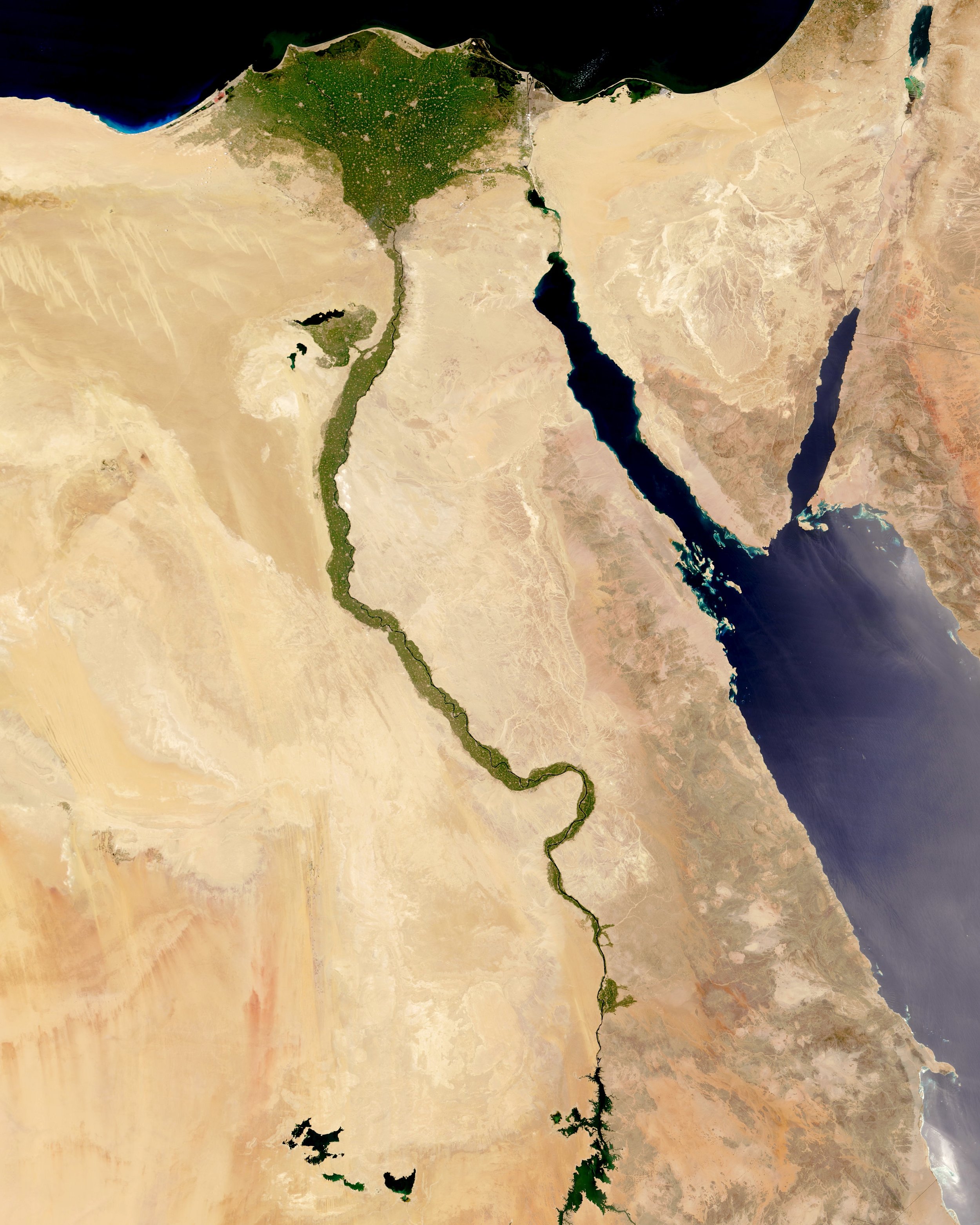 The Nile River is commonly regarded as the longest river in the world, flowing for 4,258 miles (6,853 km) over 11 countries in northeastern Africa. In this Overview, it is shown flowing north through Egypt, forming a large triangular delta before emptying into the Mediterranean Sea. Civilizations since ancient times have depended on the waters of the Nile to flood and fertilize surrounding desert lands.