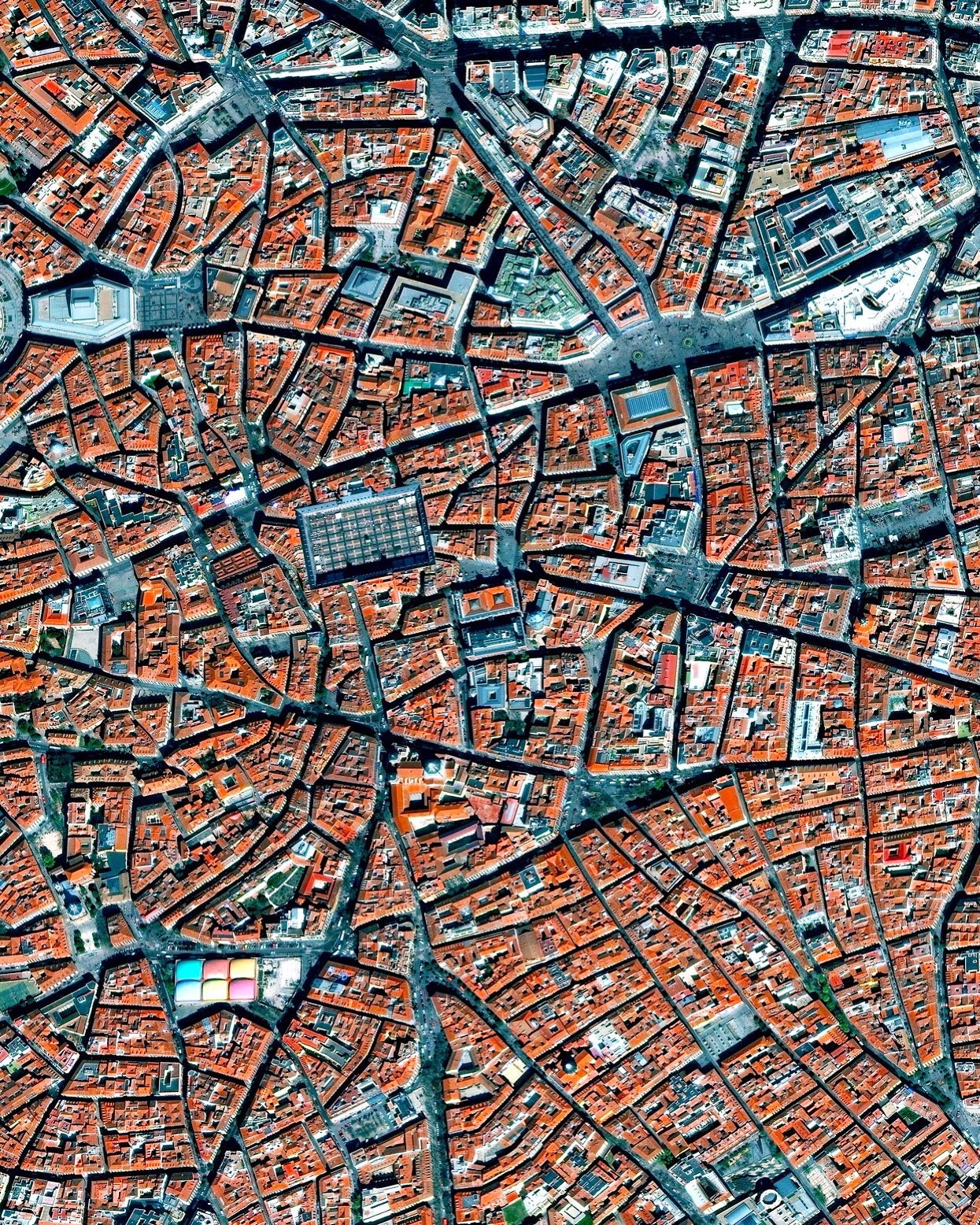 La Latina is a neighborhood located in the center of Madrid, Spain. The area was named after an old hospital of the same name that was founded in 1499. In the lower left of this Overview, you can also see the popular Mercado de la Cebada market, with its six-panel, multi-colored rooftop.