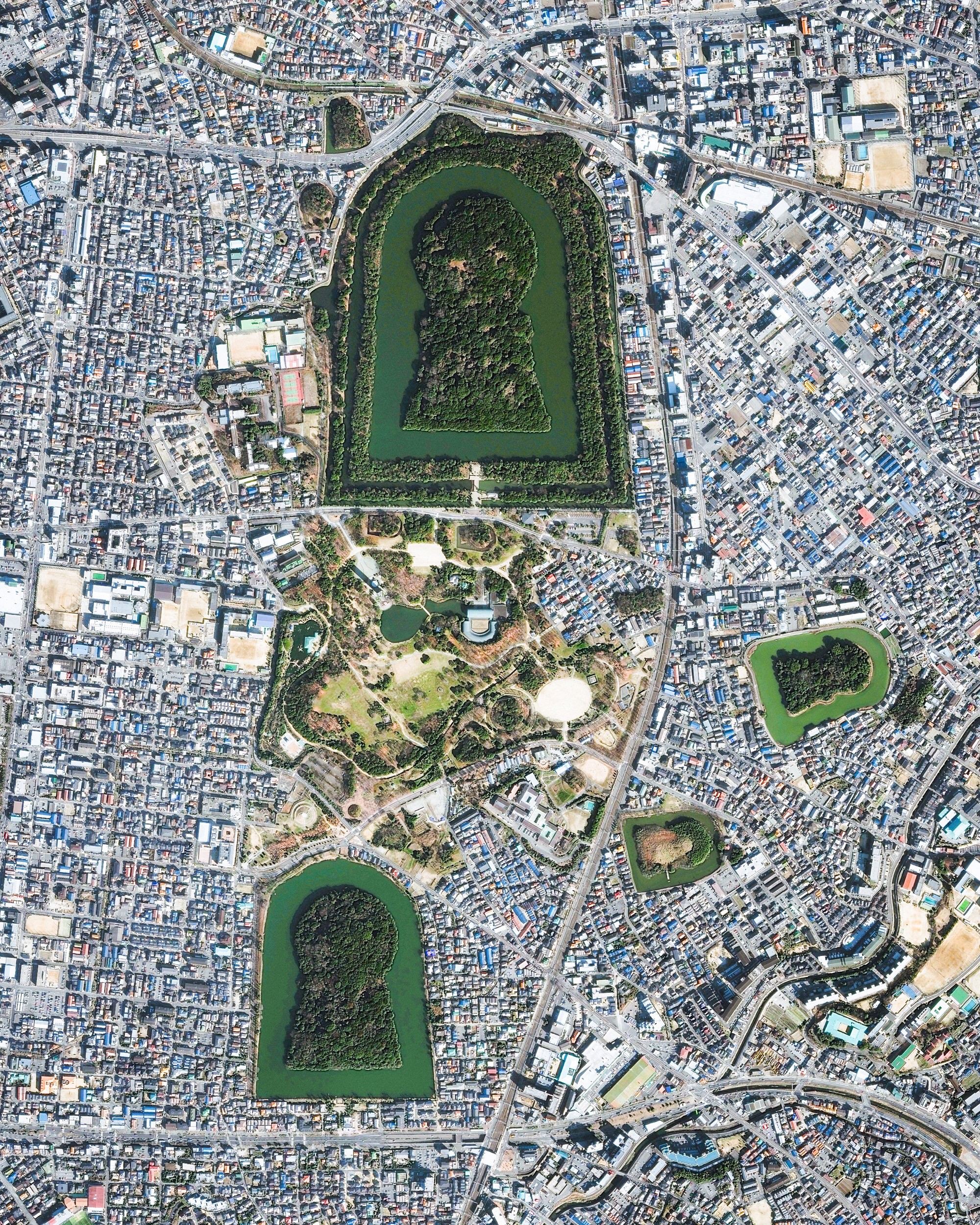 Keyhole-shaped tumuli are scattered throughout the city of Sakai in Japan's Osaka Prefecture. A tumulus is a mound of earth or stone raised over a grave, and the largest one shown in this Overview is the final resting place of Emperor Nintoku. Nearly 1,600 feet (486 m) long with a mound 115 feet (35 m) high, it covers the largest area of any tomb in the world.