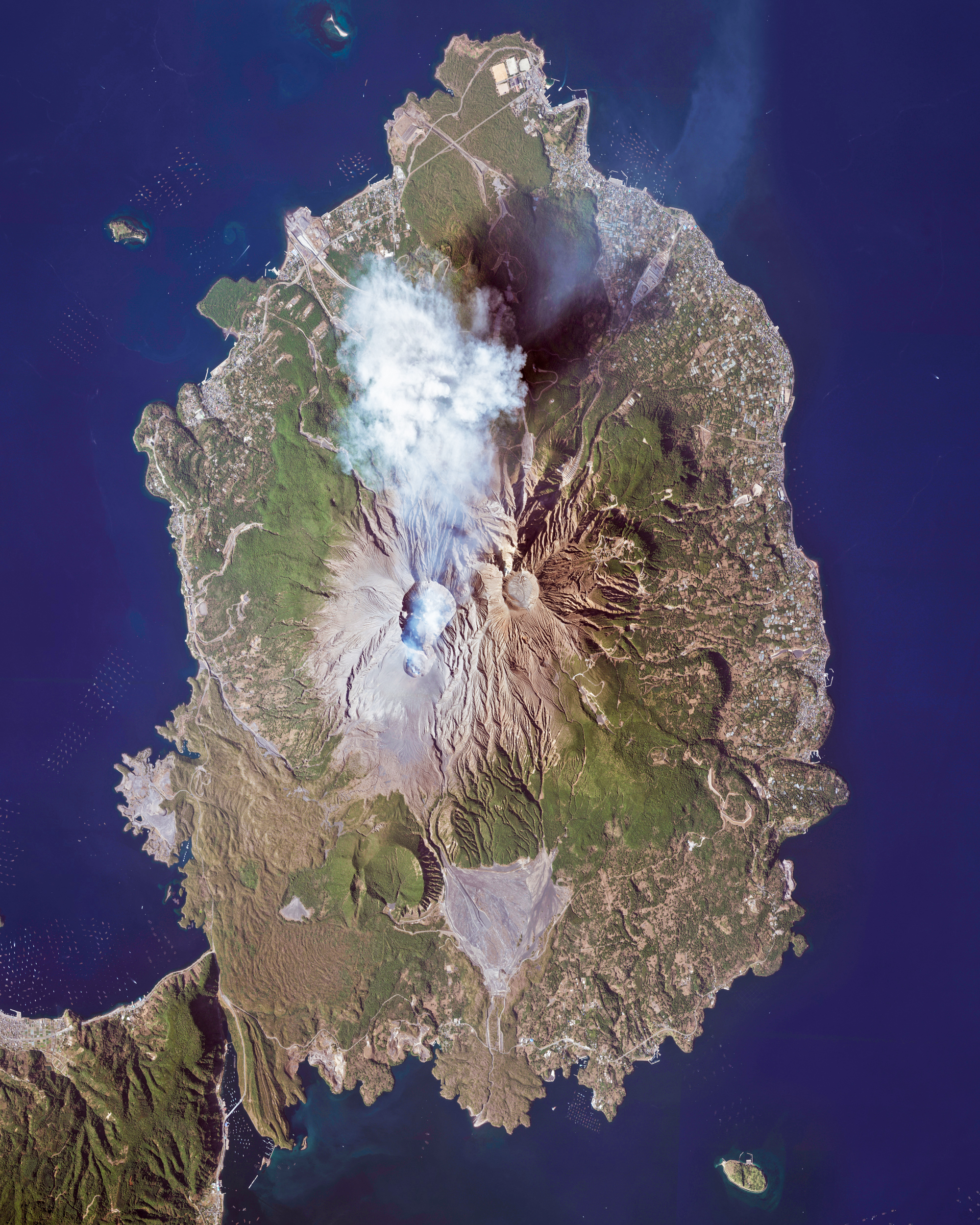 Sakurajima is an active stratovolcano and a former island in Kyushu, Japan. Lava flows from the volcano’s 1914 eruption connected it with the Osumi Peninsula, as shown in the bottom left of this Overview. Since 1955, Sakurajima has been erupting almost constantly, producing thousands of small explosions every year.