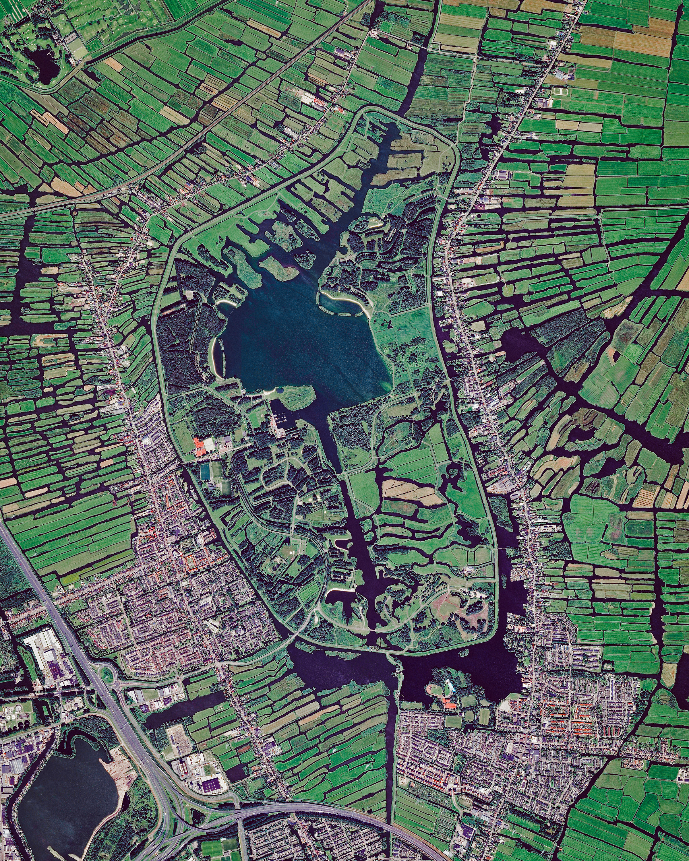 Peat ponds and polders form a unique landscape in the Twiske, a large recreation area and nature reserve in the northwest of the Netherlands. Polders are low-lying pieces of reclaimed land protected by dikes, and roughly 4,000 of them exist in the Netherlands. Located just north of Amsterdam, the Twiske is home to a wealth of reed and water birds, foxes, ermines, and other wildlife.