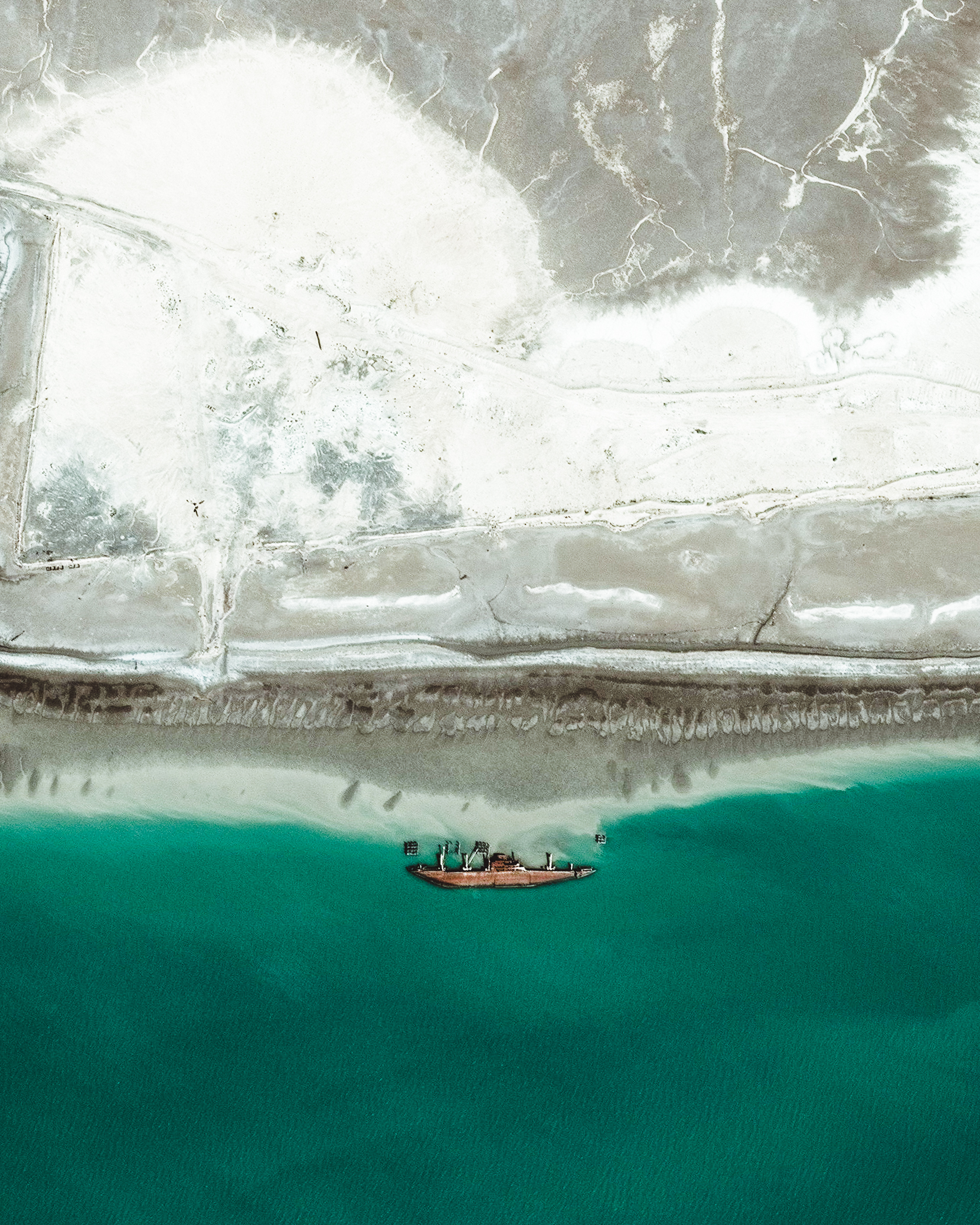 A large boat lies overturned in the Khawr Abd Allah estuary, near the city of Umm Qasr in southern Iraq. Since this waterway is close to Iraq’s borders with Kuwait and Iran, it has played an important role in regional conflicts, such as the Iran-Iraq War and the First Gulf War.