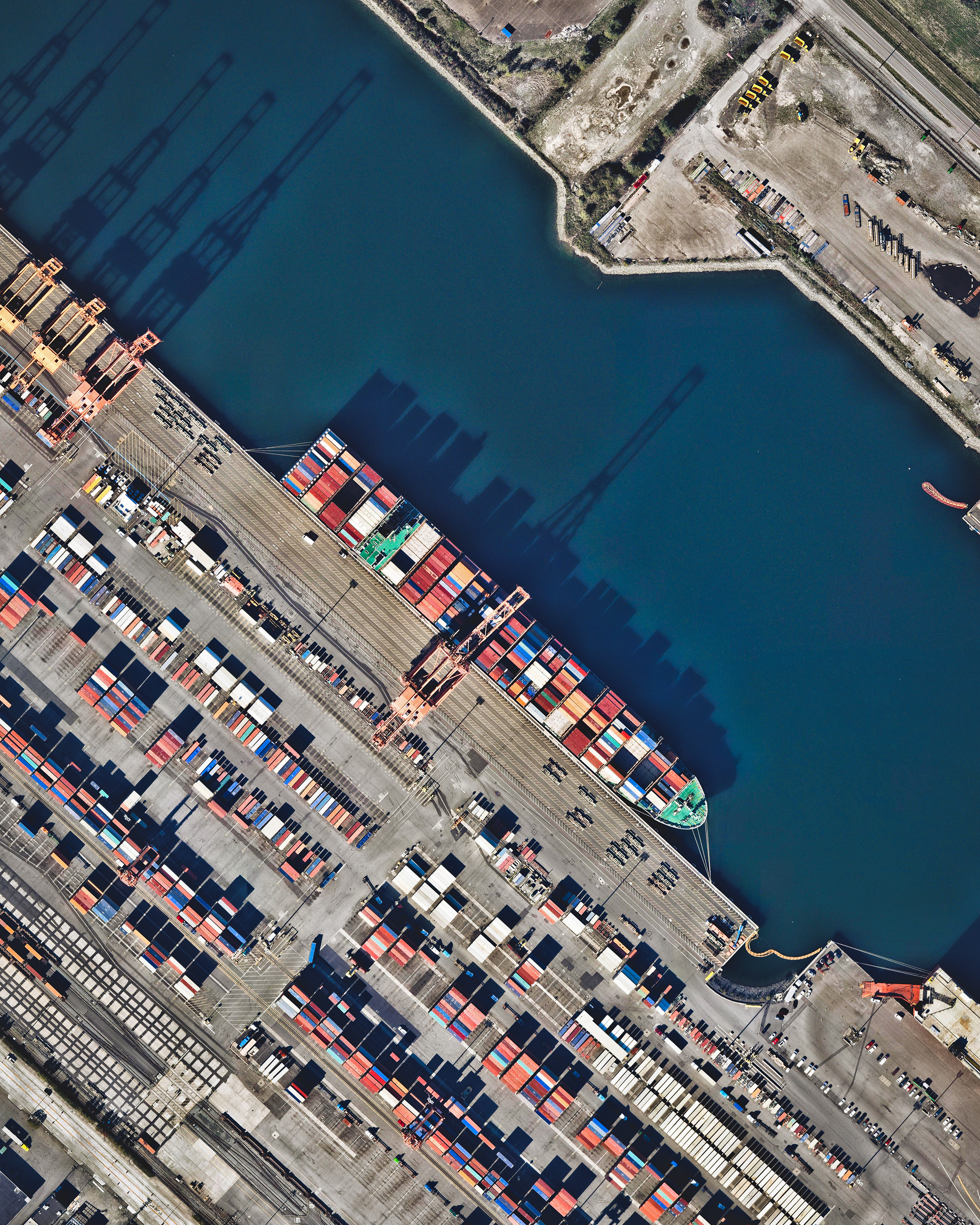 A freighter full of shipping containers docks in the Port of Tacoma, located in Washington State. Together, the Ports of Tacoma and Seattle make up the fourth-largest container gateway in North America. In 2016, cargo traffic through the ports totaled 3.6 million twenty-foot equivalent units (TEUs) weighing 28 million metric tons.