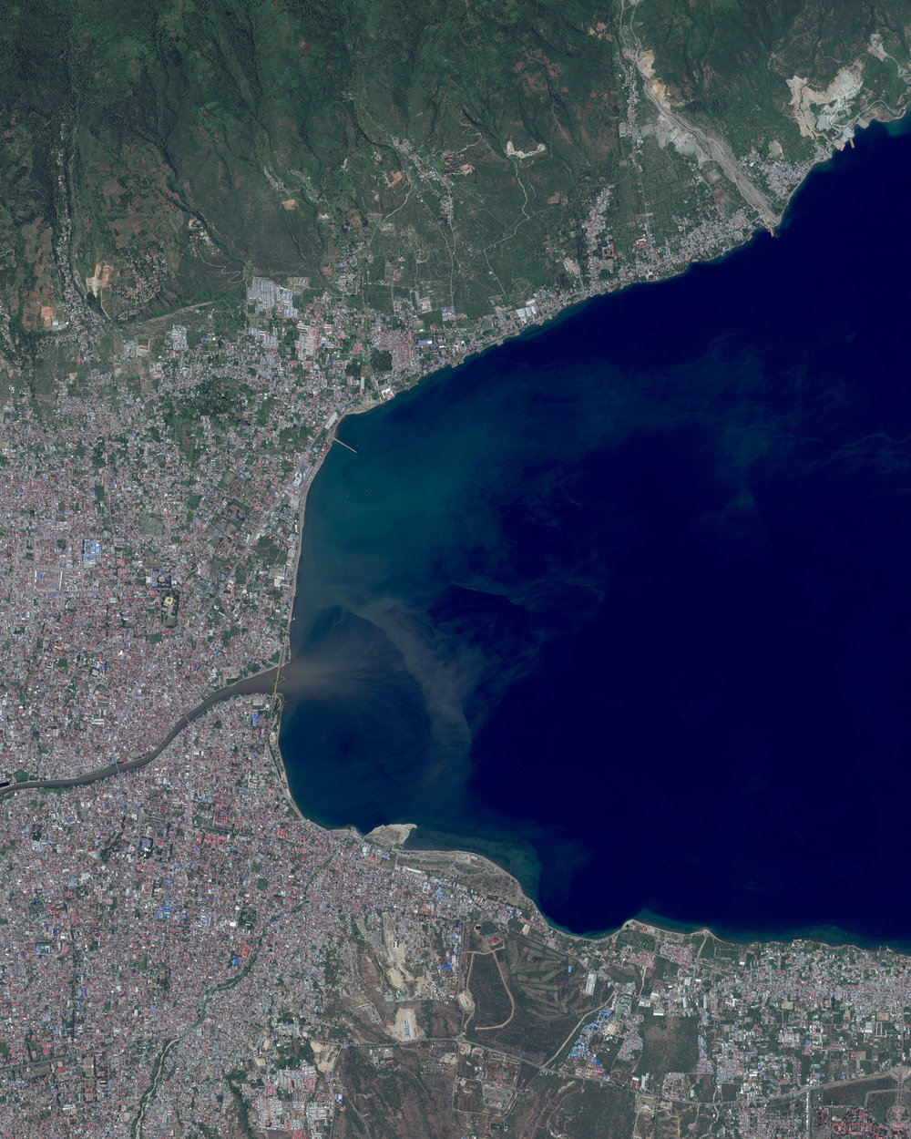 These Overviews show Palu, Indonesia, before and after it was hit by a magnitude 7.5 earthquake and a roughly 30-foot-high (9 m) tsunami late last month. At first glance, we notice a considerable amount of sediment and debris from the storm has washed into Palu Bay, and as we zoom in, we see more detailed damage to the city’s infrastructure, including the Jembatan Palu IV Bridge. Palu was hardest hit by the disaster, but other areas on the island of Sulawesi were also affected. The death toll has risen well above 2,000 and more than 80,000 people have been left homeless or otherwise displaced, with miles of coastline destroyed.
