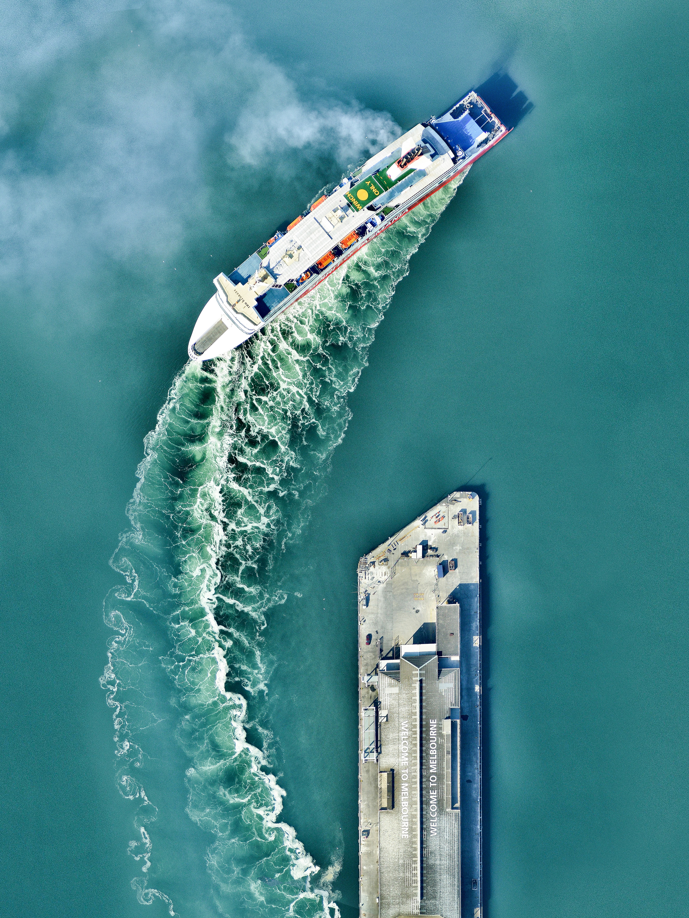 The MS Spirit of Tasmania backs away from a pier in the Port of Melbourne, Australia. This ferry makes daily trips to and from Melbourne and Devonport, Tasmania — a journey of roughly 9 hours. Tasmania is an island state of Australia, located 150 miles (240 km) to the south of the Australian mainland.