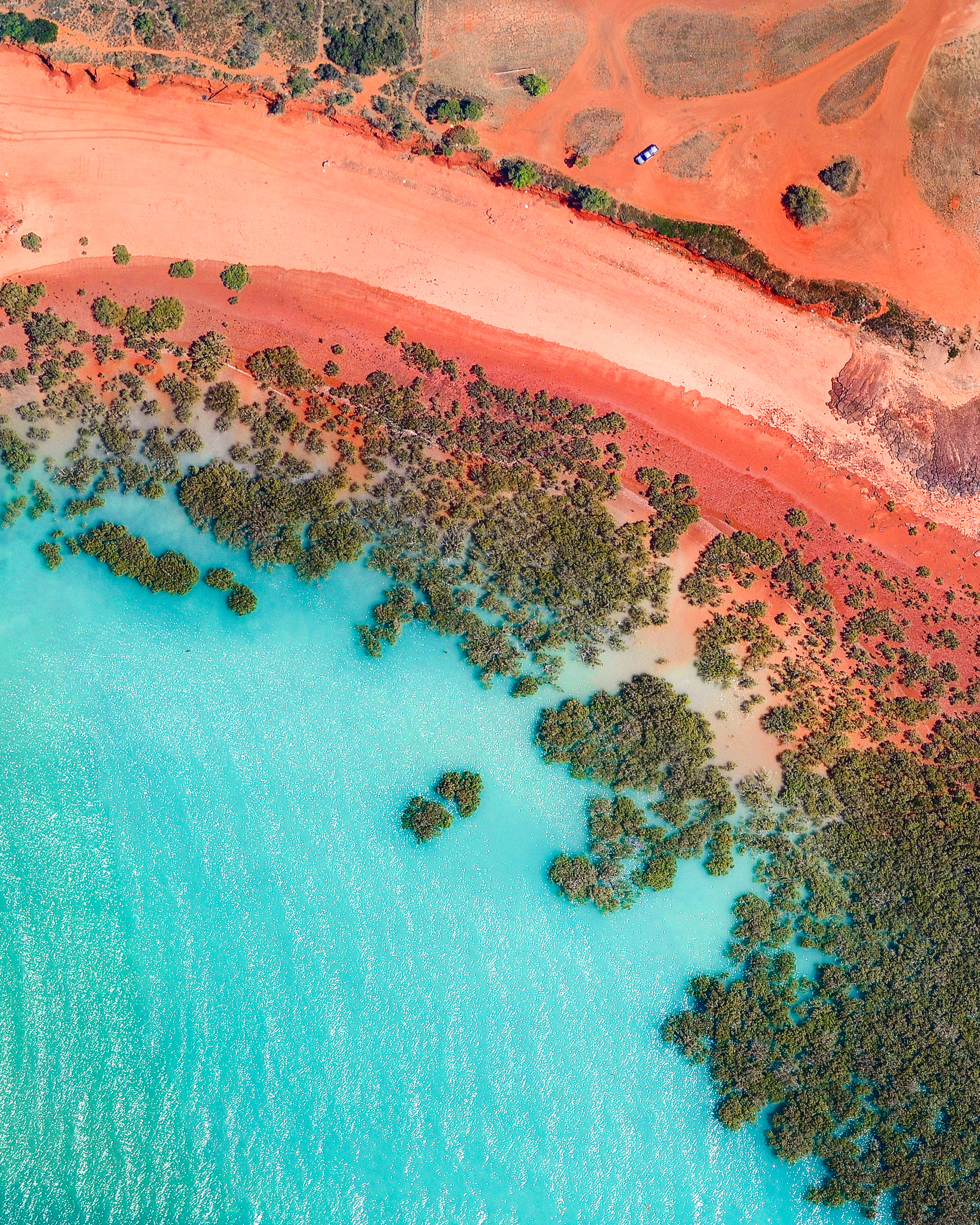 The aquamarine water of Roebuck Bay rolls onto red sand in Broome, Western Australia. A coastal town, Broome is home to roughly 14,000 people, but its population can grow to upwards of 45,000 per month during peak tourist season from June to August.