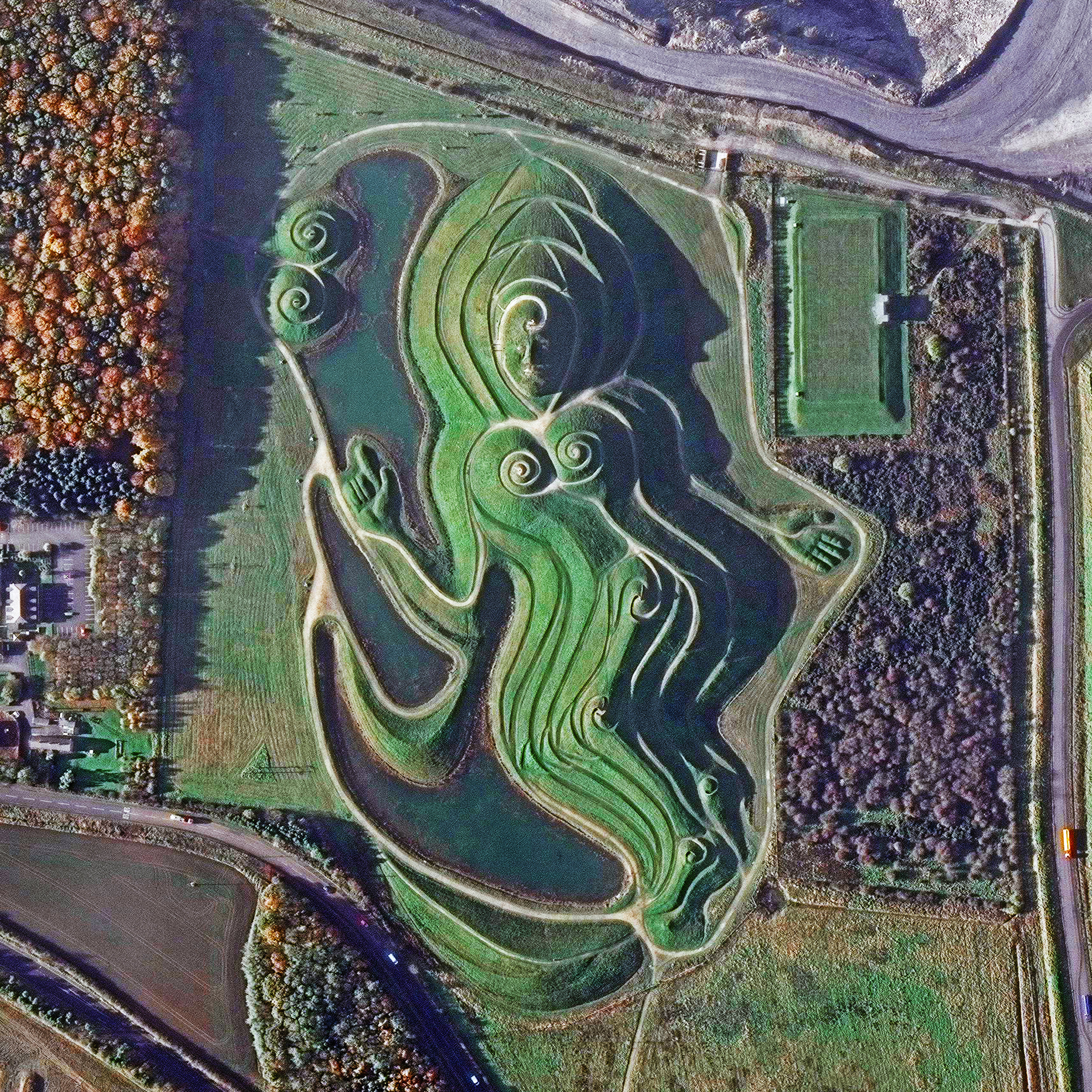 Northumberlandia, or “Lady of the North,” is a massive land sculpture in the shape of a reclining female figure near the town of Cramlington in northern England. Completed in 2012, the sculpture is made of 1.5 million metric tonnes of earth removed from the neighboring Shotton Surface Mine. It is 112 feet (34 m) high and 1,300 feet (400 m) long.