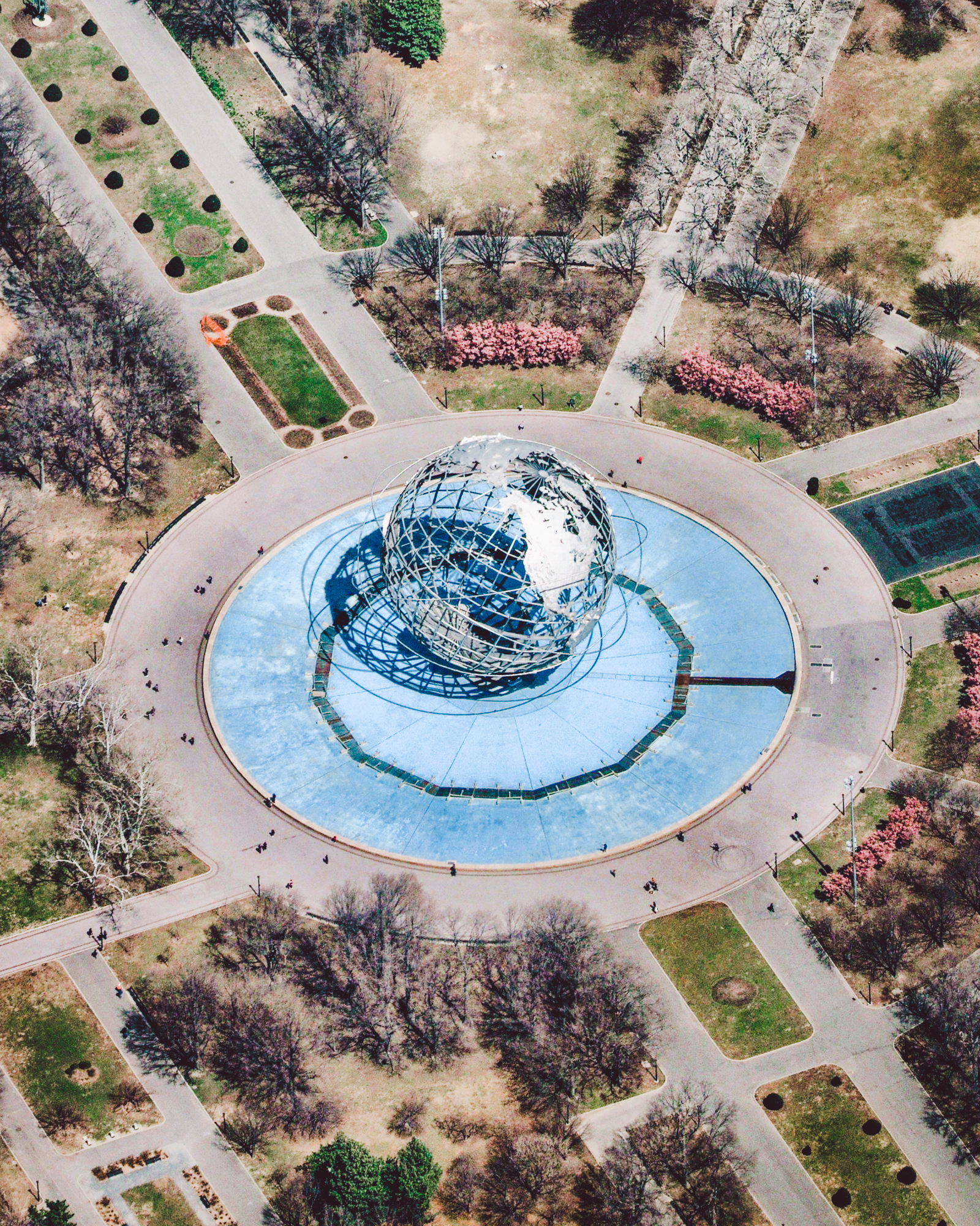 The Unisphere is a spherical stainless steel representation of the Earth, located in Flushing Meadows-Corona Park in the New York City borough of Queens. Commissioned as part of the 1964 New York World’s Fair, the sculpture was dedicated to “man’s achievements on a shrinking globe in an expanding universe.” It is 140 feet (43 m) high and 120 feet (37 m) in diameter.