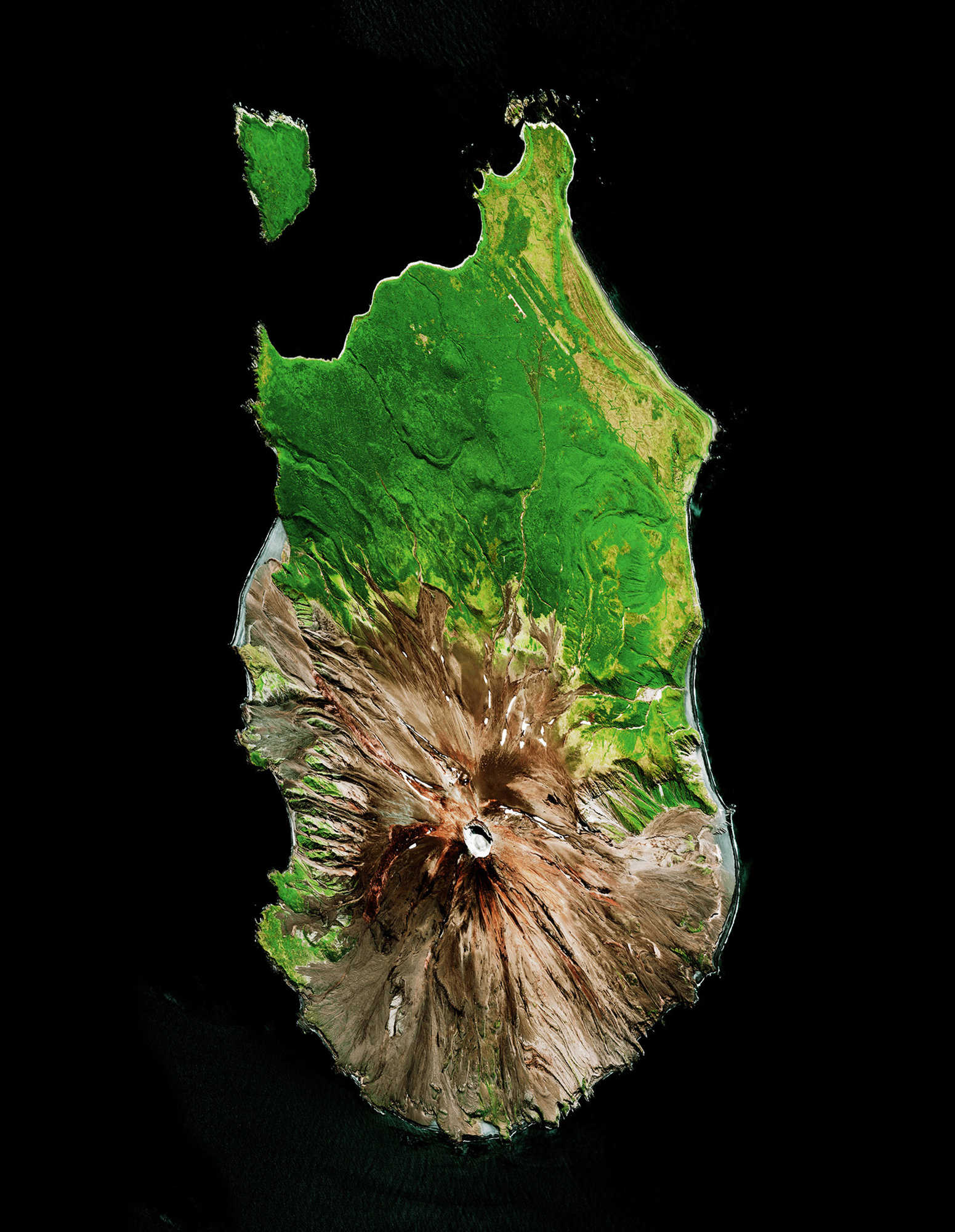 Sarychev Peak is located on Matua Island in the Kuril Islands of Russia. When the volcano erupted on June 11, 2009, the expulsion of debris caused significant interruption to air traffic between east Asia and North America. The eruption was also so great that astronauts aboard the International Space Station were able to photograph the plumes of ash and smoke rising from its cone, as the force of its shock waves dispersed all clouds covering the area.