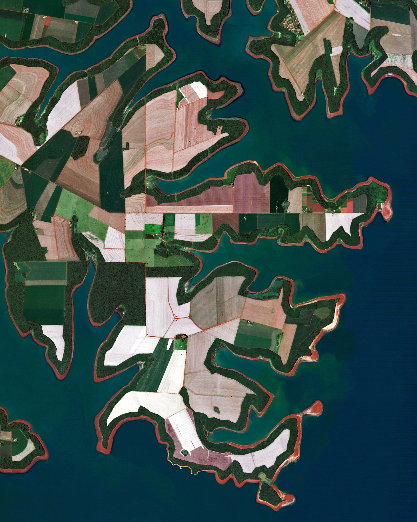Agricultural fields line the shores of the Itaipu Reservoir — a body of water that forms the border between Brazil and Paraguay. The area’s tropical climate makes it an ideal place to grow sugarcane, coffee, tea, and cotton.