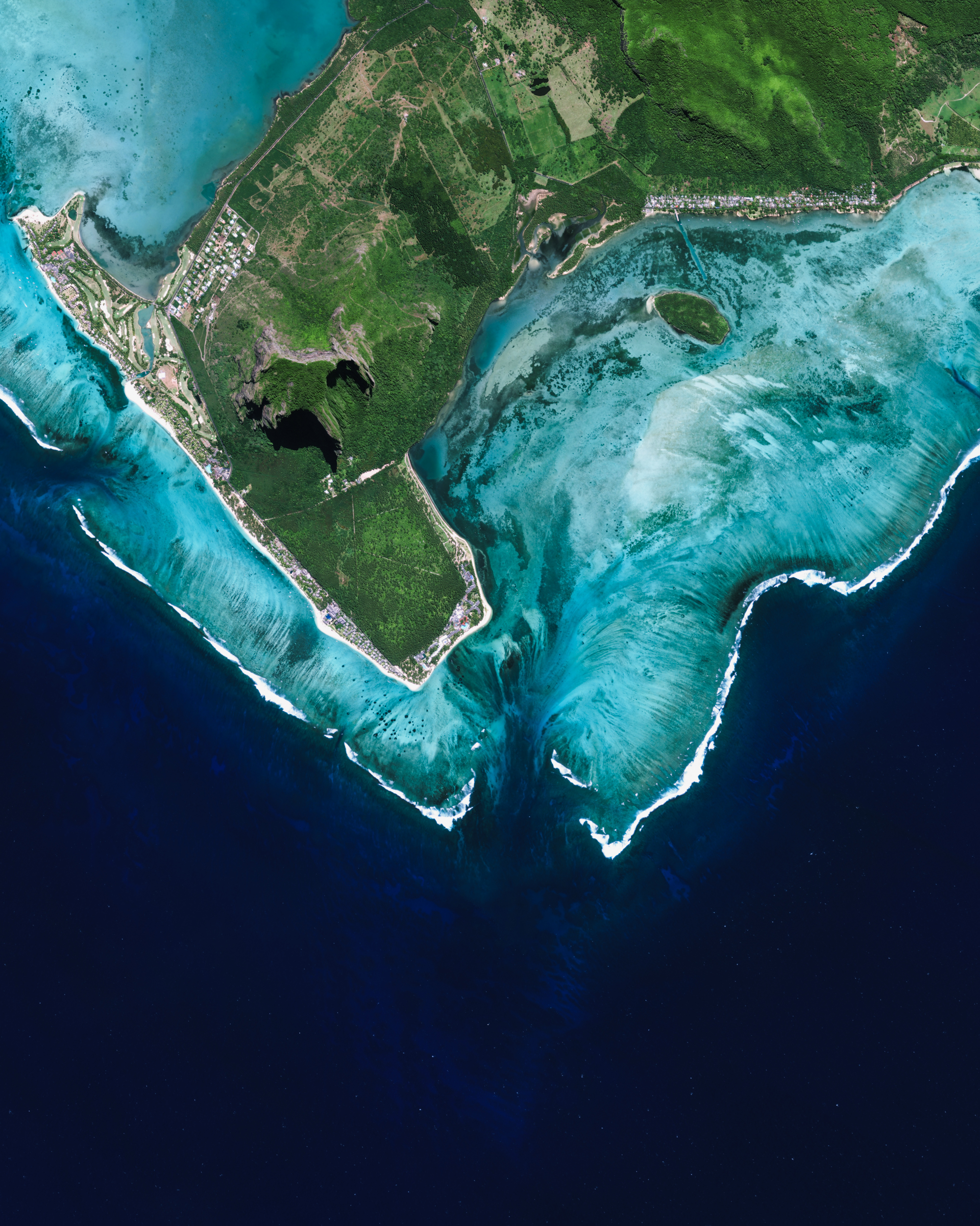 Just off the southwestern corner of Mauritius (shown at the center of this Overview) is what appears to be an underwater waterfall. In reality, it is just the flow of underwater currents and sand patterns on the ocean floor that form this spectacular optical illusion from the aerial perspective. Mauritius is an island nation in the Indian Ocean, roughly 1,200 miles (2,000 km) off the southeastern coast of Africa.
