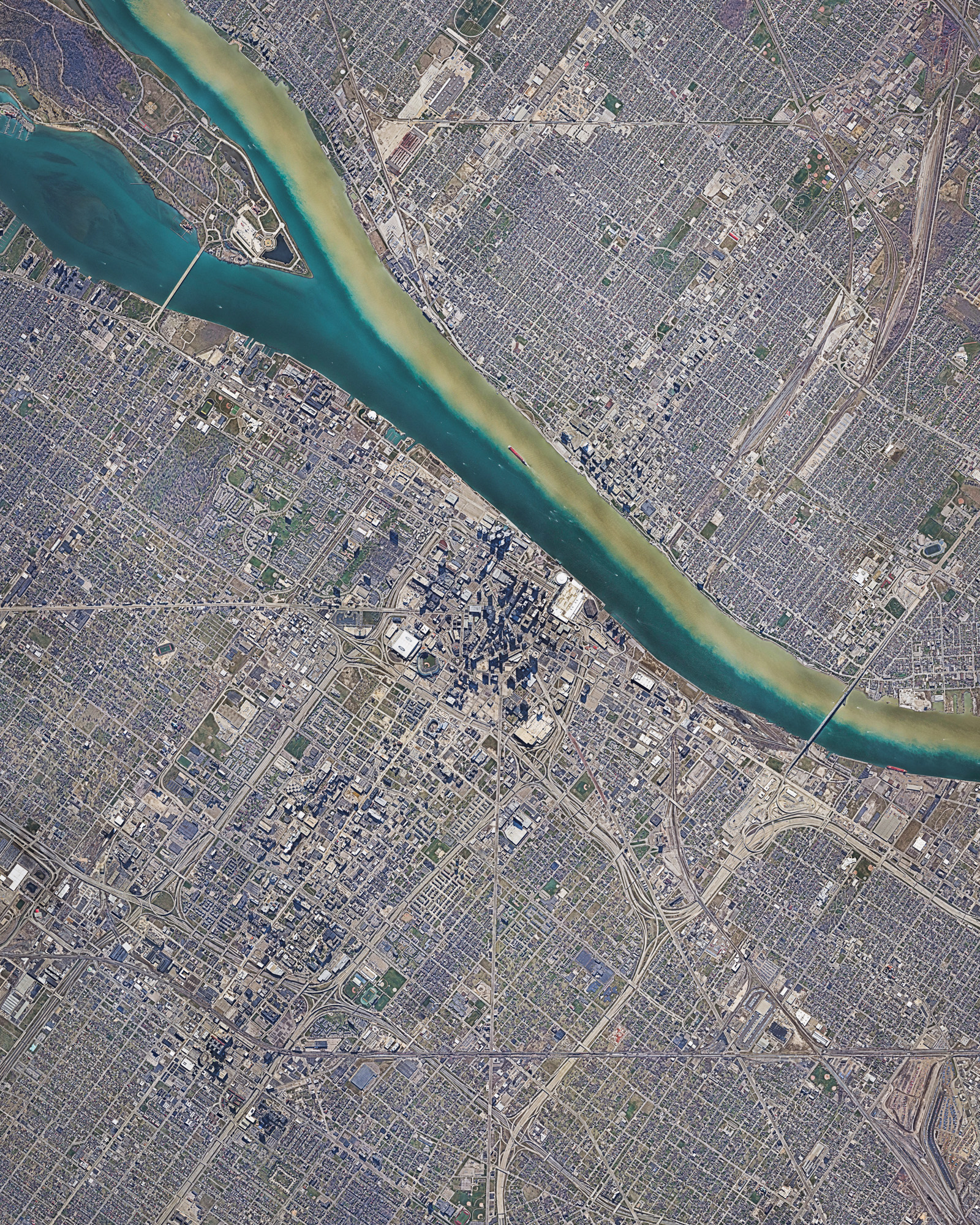 Detroit is the largest and most populous city in the state of Michigan, with 4.3 million residents in its metropolitan area. It is best known as the center of the U.S. automobile industry, housing the headquarters of General Motors, Ford and Chrysler. Detroit is also a major port on the Detroit River, which is shown flowing through the city in this Overview — does anyone know why the river has two shades?