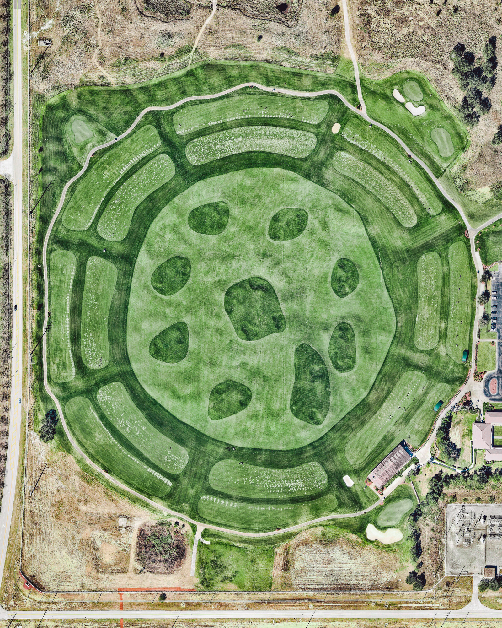 A large circular driving range is seen here at the Orange County National Golf Center and Lodge in Winter Garden, Florida. Including putting greens and a short-game practice area, the facility covers 42 acres (17 hectares). It is visited by many golf professionals every year; in fact, Tiger Woods once used the driving range to film a commercial with Nike.