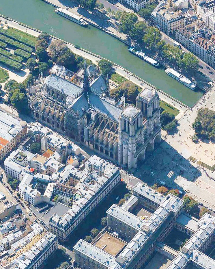 On Monday, April 15, humanity lost timeless pieces of Gothic architecture when fire nearly destroyed Notre Dame Cathedral in Paris, France. The landmark, which took nearly two centuries to build, lost much of its 800-year-old roof and saw its 19th century spire collapse during the 15-hour blaze. Fortunately, its central structure is still intact, and French President Emmanuel Macron has pledged to restore Notre Dame within five years. This aerial photograph shows Notre Dame before the fire, and we hope to bring you post-fire imagery soon.