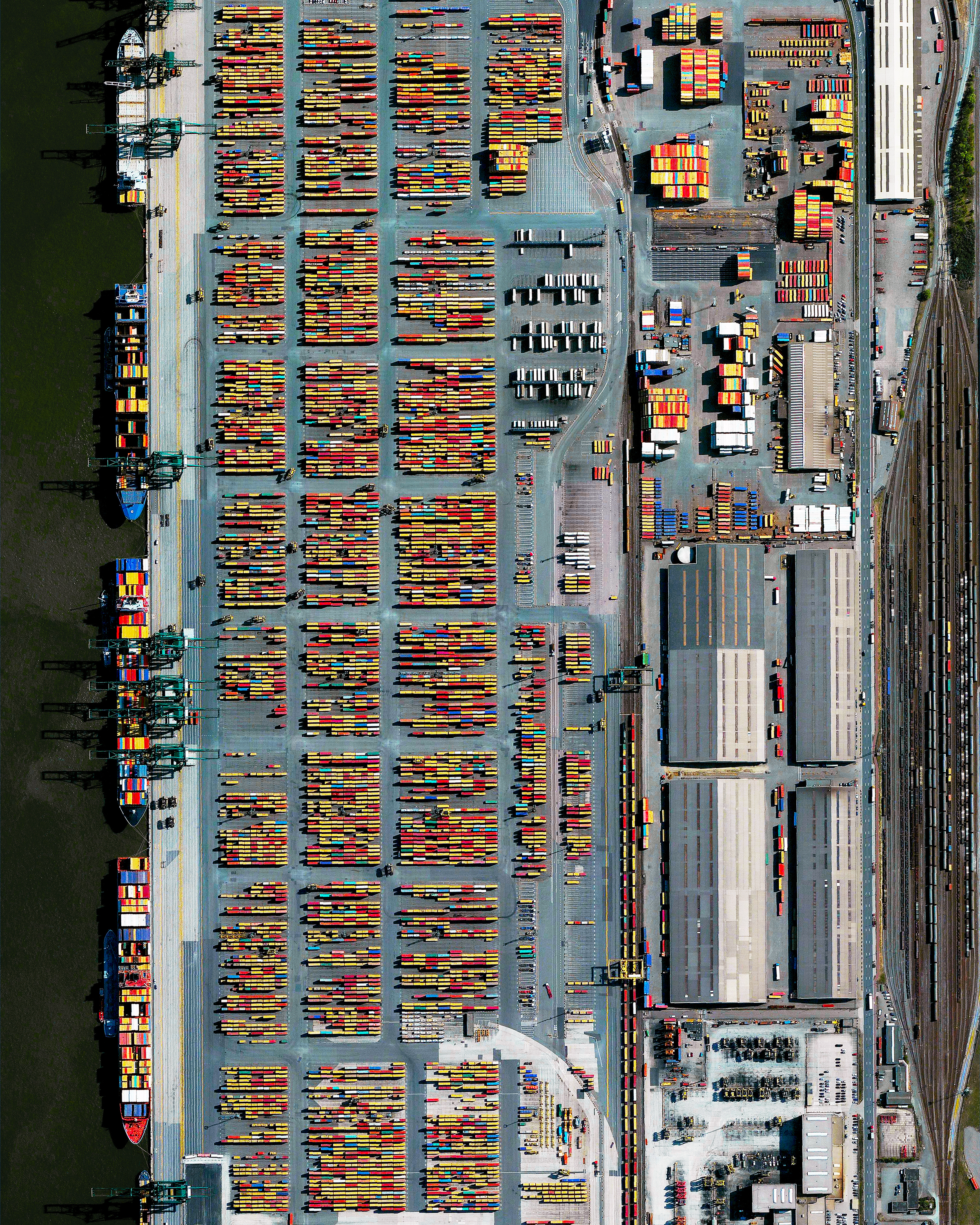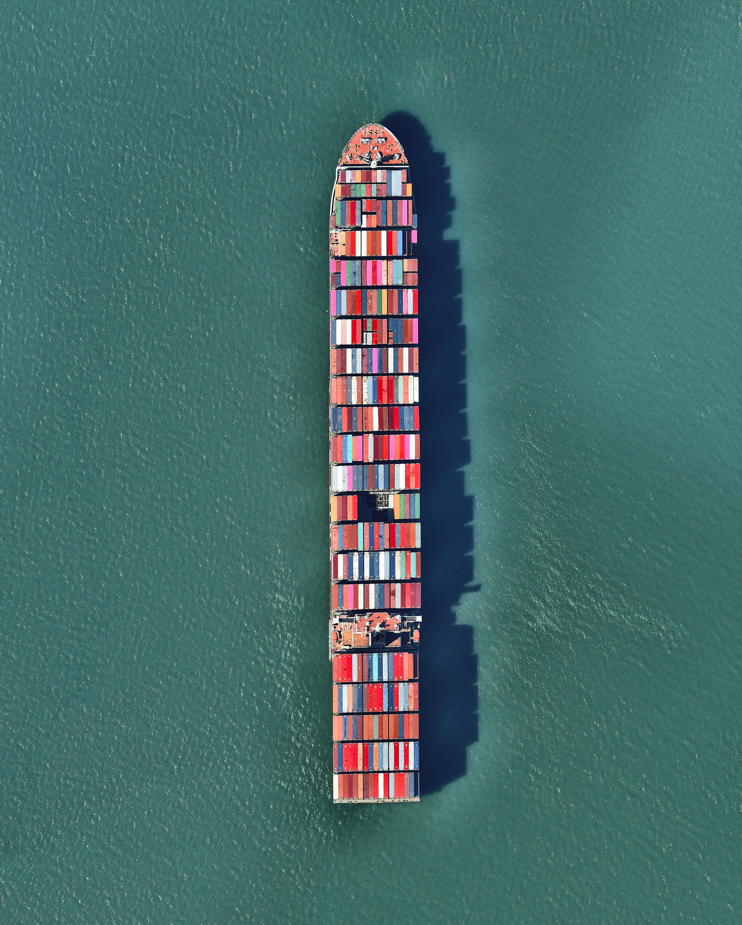A ship full of containerized cargo navigates San Francisco Bay, located between San Francisco and Oakland, California. Due to San Francisco's limited real estate, Oakland has served as the primary Bay Area port since the 1960s. The Port of San Francisco handled no containerized cargo in 2017, whereas the Port of Oakland had a throughput of nearly 2.5 million twenty-foot equivalent units (TEUs) that year.