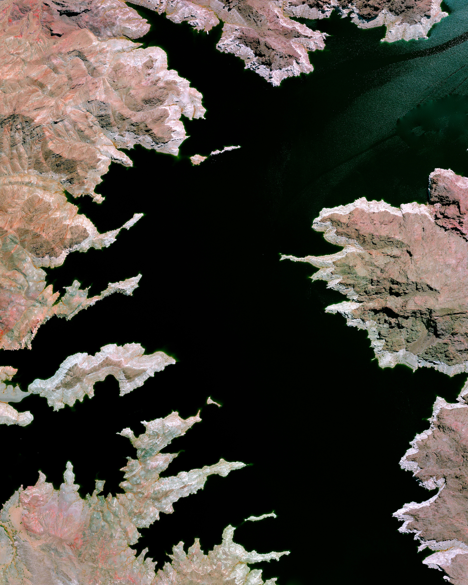Lake Mead — located on the Colorado River 24 miles (38 km) southeast of Las Vegas, Nevada — is the largest reservoir in the United States. The lake was formed with the creation of the Hoover Dam in the 1930s. Due to a combination of drought and increased water demand in the surrounding states (specifically California, Nevada, New Mexico, and Arizona) the lake’s water level has been lowering drastically in recent years. This decreasing water level exposes the white shoreline that is visible in this Overview.