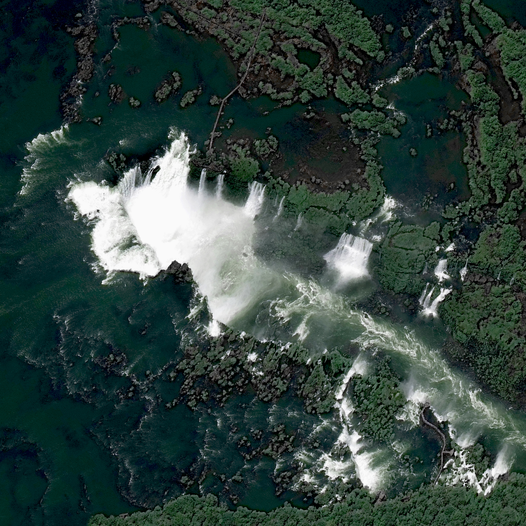 Iguazu Falls, the largest waterfall system in the world, is located on the border of Argentina and Brazil. Approximately half of the Iguazu River flows into a long and narrow chasm called the Devil's Throat — the u-shaped falls seen here — that is roughly 269 feet (82 m) high. The total number of waterfalls at Iguazu fluctuates between 150 and 300, depending on the water level.
