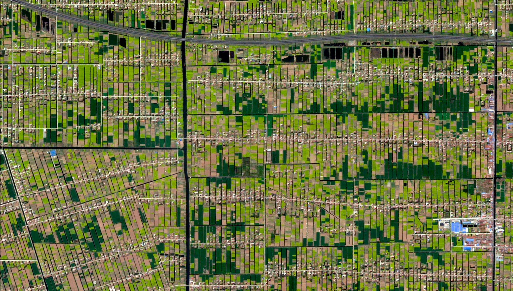 Individual homes and agricultural lots stretch across the landscape of Jiulongzhen in the Anhui Province of China.