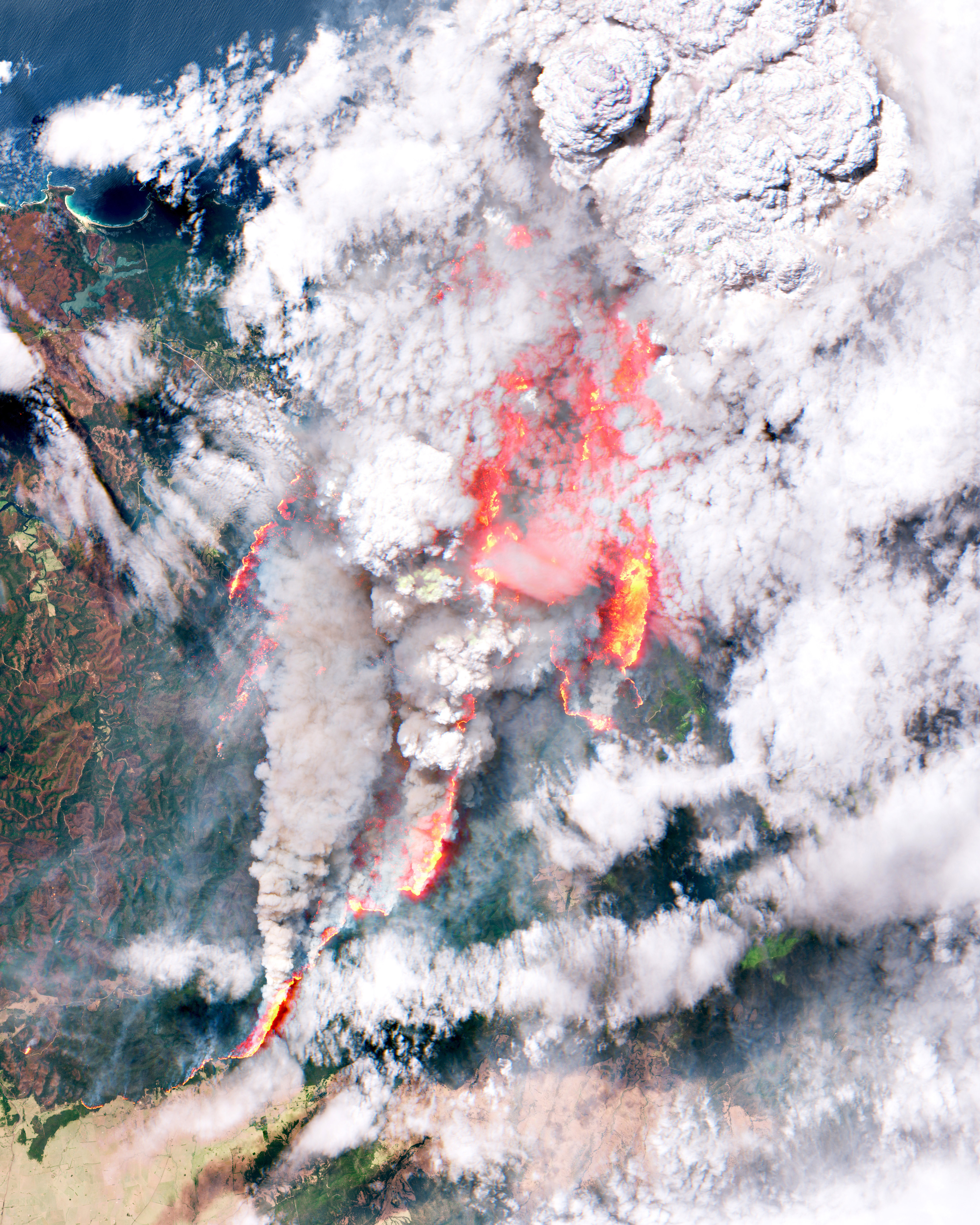 Active bushfires affecting a 3,000 square mile area of New South Wales, Australia are shown in this Overview. The massive burn accounts for just a portion of the 38,000 square miles that have already been engulfed by the historic burn. This coastal area of the country contains eucalyptus trees, which release volatile oils when burned, thereby creating massive embers than can quickly jump to other areas of the forest. Climate conditions have not helped matters – the warmest year in Australian history combined with lowest rainfall since 1900 created the dry conditions for the blaze. As Australia awaits the monsoon season to move south from South East Asia, firefighters and volunteers continue to try everything in their power to stop the continued spread. With 500 million animals estimated to have been killed so far, the fires continue to devastate wildlife and cause unfathomable destruction, forcing many to flee their homes.Read the full story →
